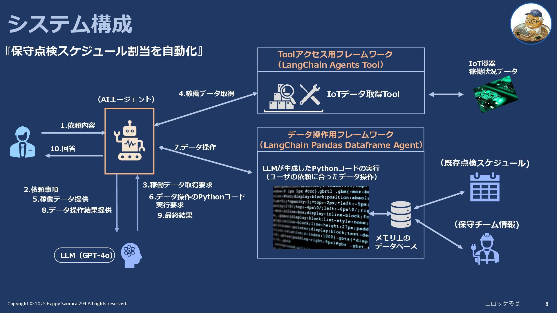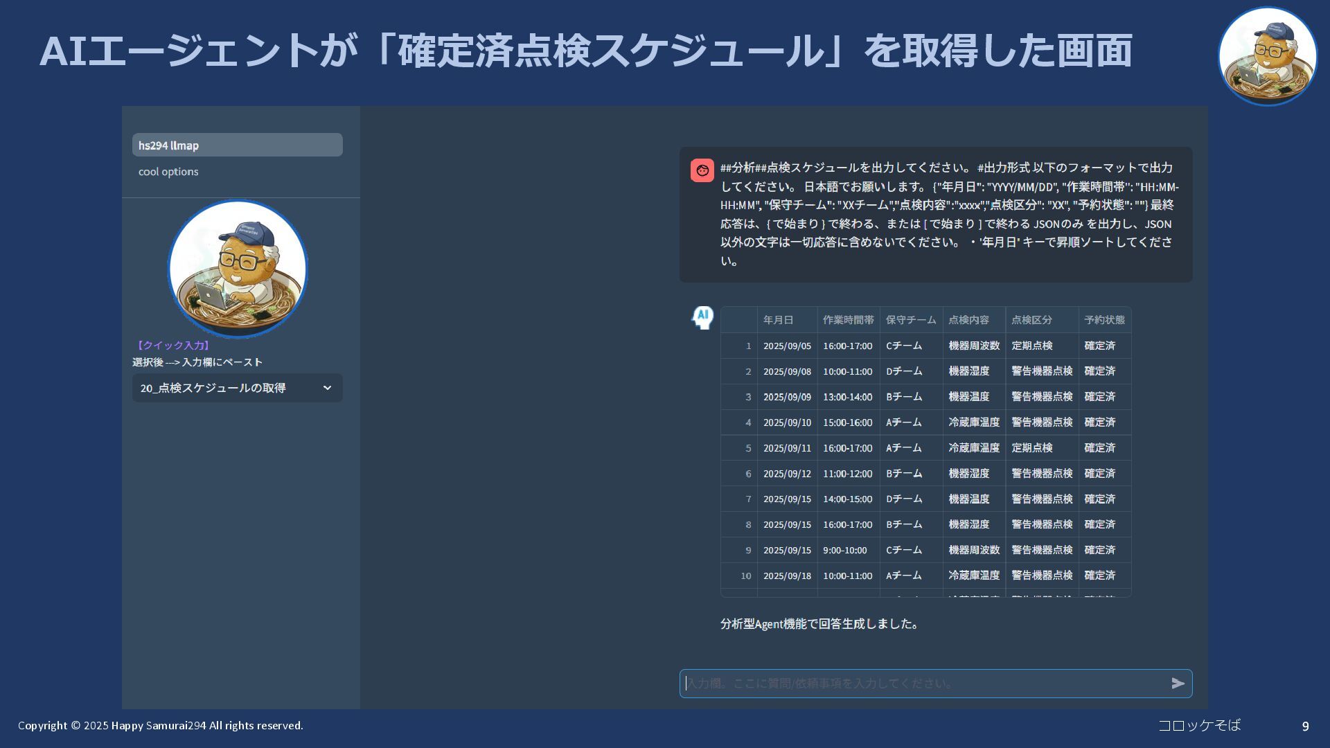 8 システム構成 『保守点検スケジュール割当を自動化』 10.回答 1.依頼内容 (AIエージェント) IoT機器 稼働状況データ Toolアクセス用フレームワーク IoTデータ取得Tool データ操作用フレームワーク (既存点検スケジュール) (保守チーム情報) メモリ上の データベース LLMが生成したPythonコードの実行 (ユーザの依頼に合ったデータ操作) 4.稼働データ取得 LLM(GPT-4o) 2.依頼事項 3.稼働データ取得要求 5.稼働データ提供 6.データ操作のPythonコード 実行要求 7.データ操作 8.データ操作結果提供 9.最終結果 (LangChain Agents Tool) (LangChain Pandas Dataframe Agent)