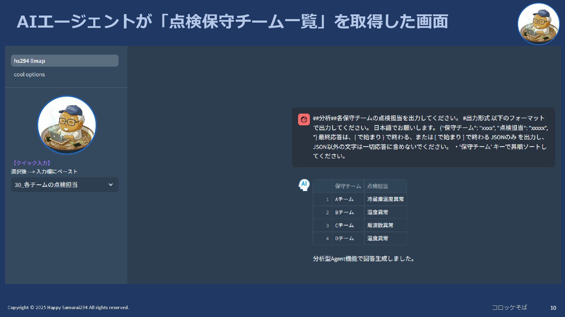10 AIエージェントが「点検保守チーム一覧」を取得した画面