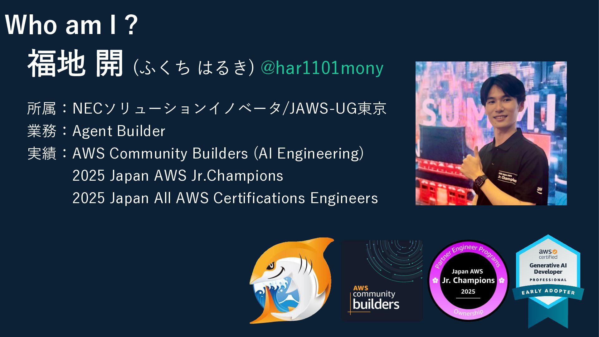Who am I ? 福地 開 (ふくち はるき) @har1101mony 所属:NECソリューションイノベータ/JAWS-UG東京