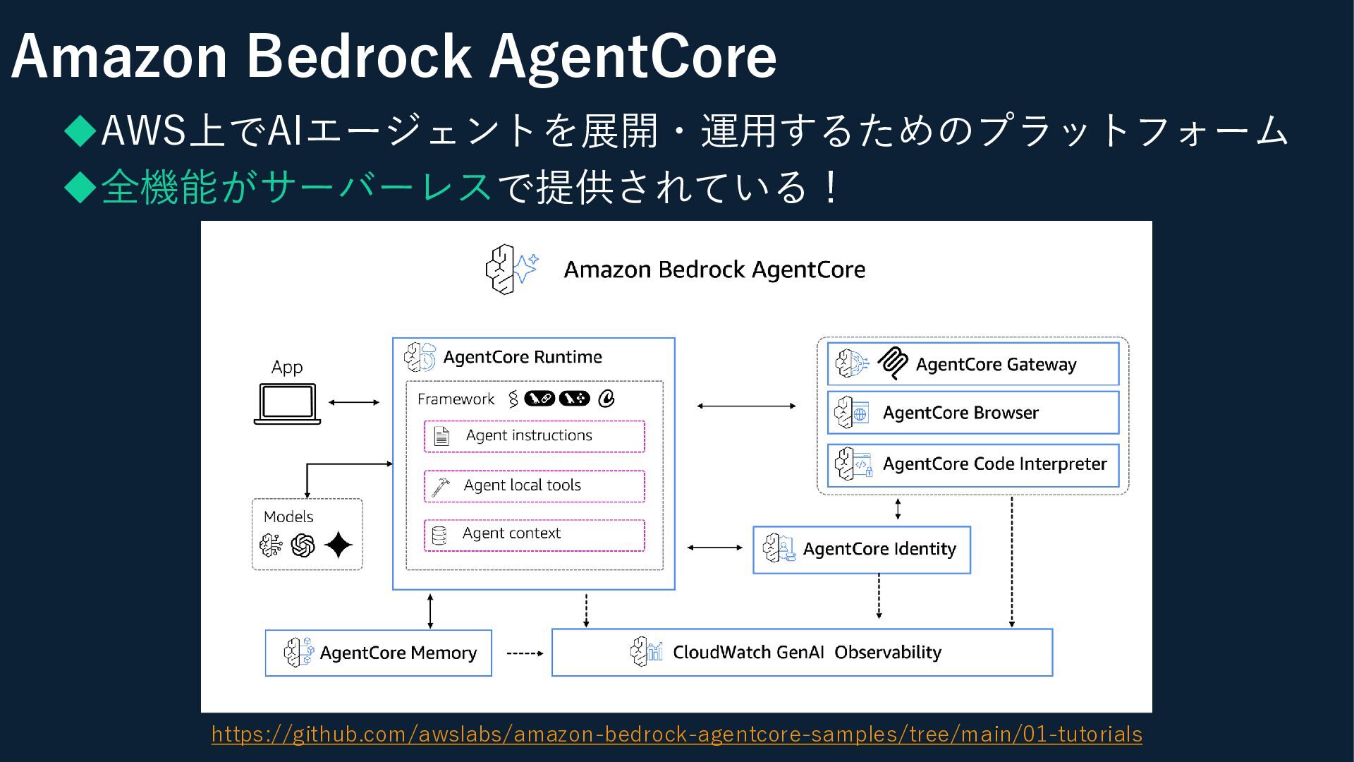 Amazon Bedrock AgentCore ◆AWS上でAIエージェントを展開・運用するためのプラットフォーム ◆全機能がサーバーレスで提供されている! https://github.com/awslabs/amazon-bedrock-agentcore-samples/tree/main/01-tutorials