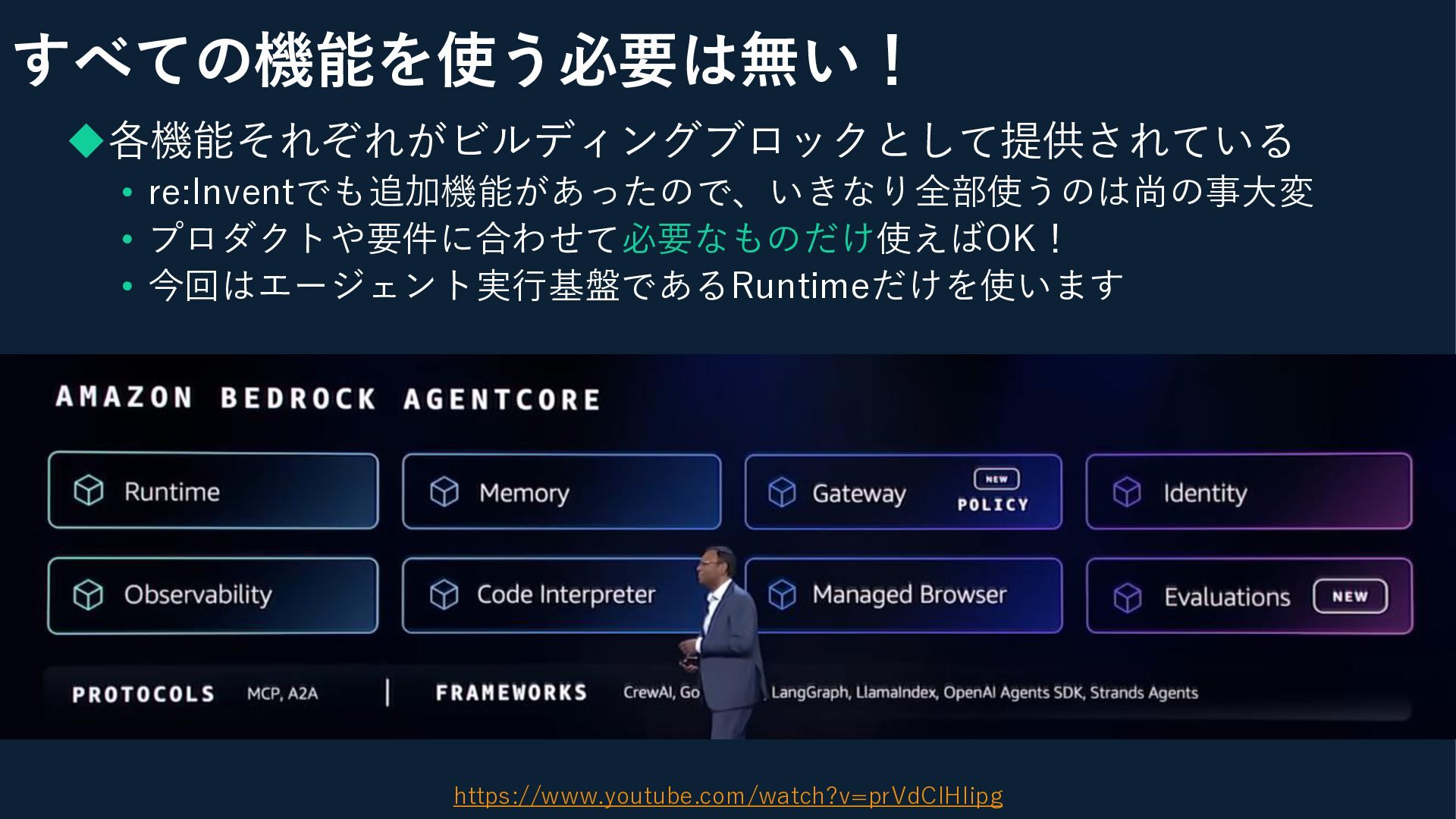 すべての機能を使う必要は無い! ◆各機能それぞれがビルディングブロックとして提供されている • re:Inventでも追加機能があったので、いきなり全部使うのは尚の事大変 • プロダクトや要件に合わせて必要なものだけ使えばOK! • 今回はエージェント実行基盤であるRuntimeだけを使います https://www.youtube.com/watch?v=prVdCIHlipg