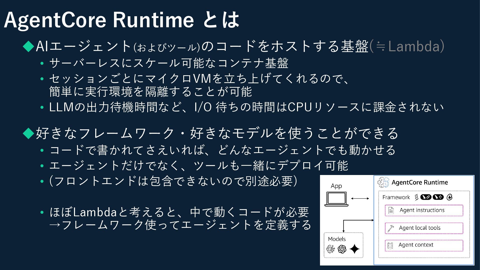 LLMの出力待機時間など、I/O 待ちの時間はCPUリソースに課金されない ◆好きなフレームワーク・好きなモデルを使うことができる • コードで書かれてさえいれば、どんなエージェントでも動かせる • エージェントだけでなく、ツールも一緒にデプロイ可能 • (フロントエンドは包含できないので別途必要) • ほぼLambdaと考えると、中で動くコードが必要 →フレームワーク使ってエージェントを定義する