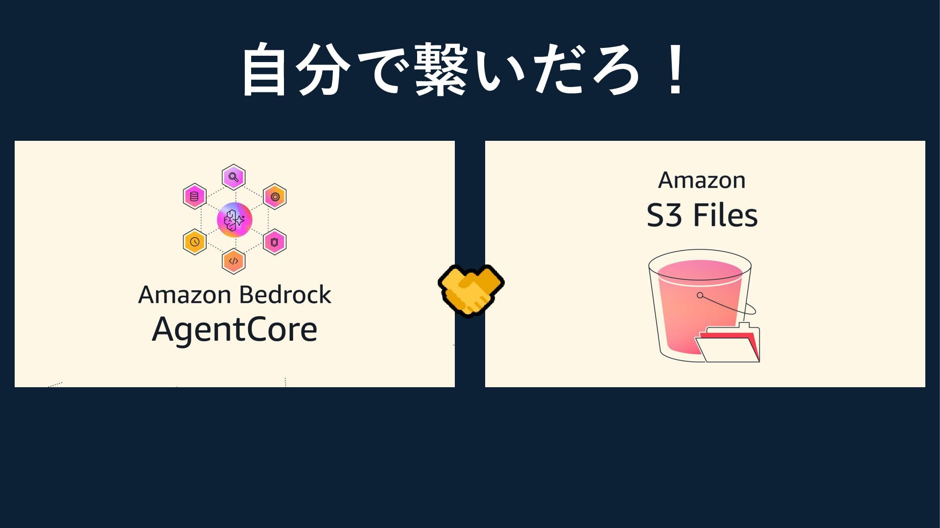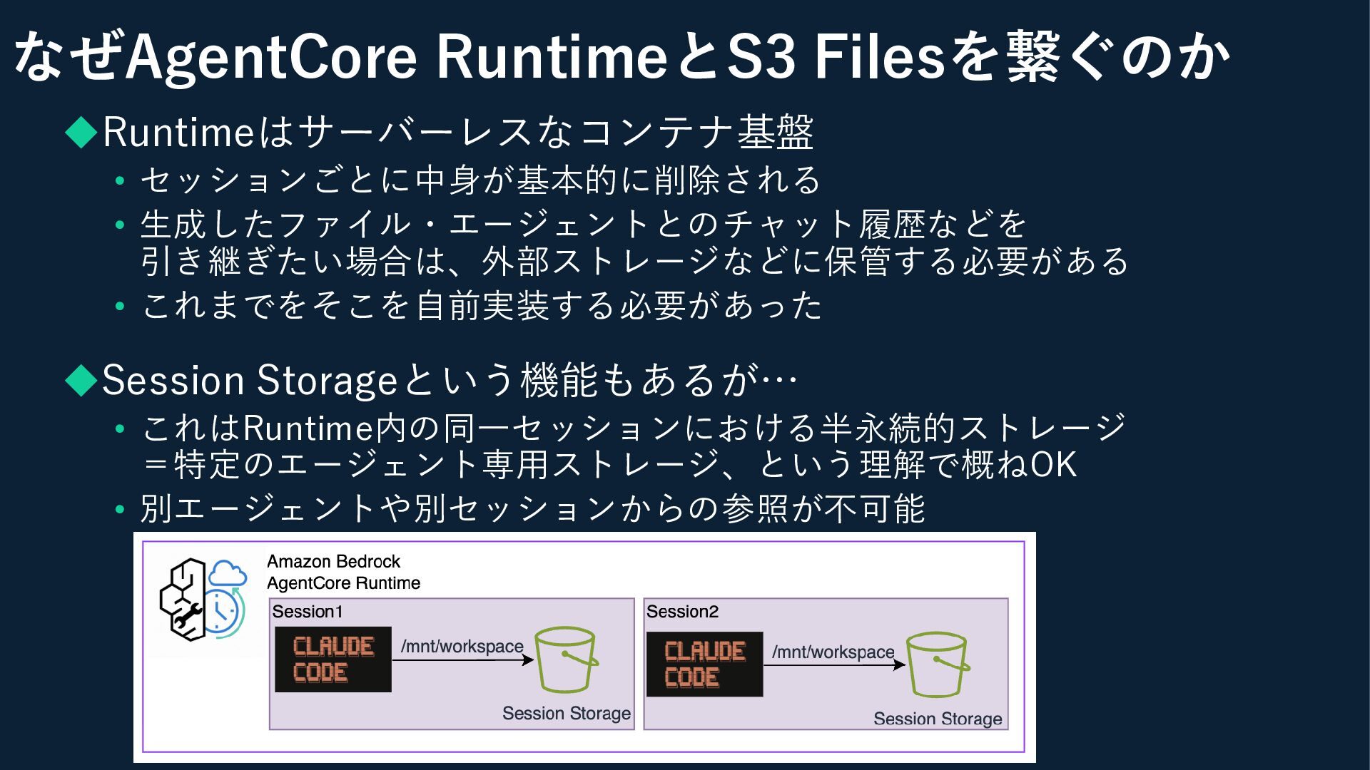 なぜAgentCore RuntimeとS3 Filesを繋ぐのか ◆Runtimeはサーバーレスなコンテナ基盤 • セッションごとに中身が基本的に削除される • 生成したファイル・エージェントとのチャット履歴などを 引き継ぎたい場合は、外部ストレージなどに保管する必要がある •