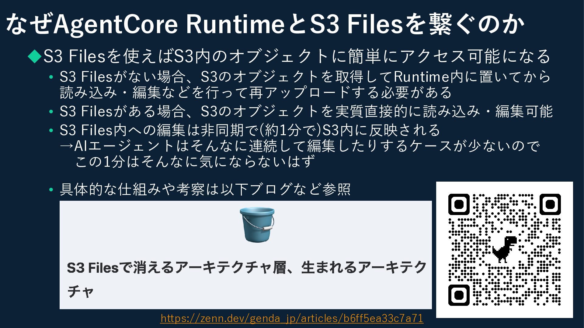 S3 Filesがある場合、S3のオブジェクトを実質直接的に読み込み・編集可能 • S3 Files内への編集は非同期で(約1分で)S3内に反映される →AIエージェントはそんなに連続して編集したりするケースが少ないので この1分はそんなに気にならないはず • 具体的な仕組みや考察は以下ブログなど参照 https://zenn.dev/genda_jp/articles/b6ff5ea33c7a71