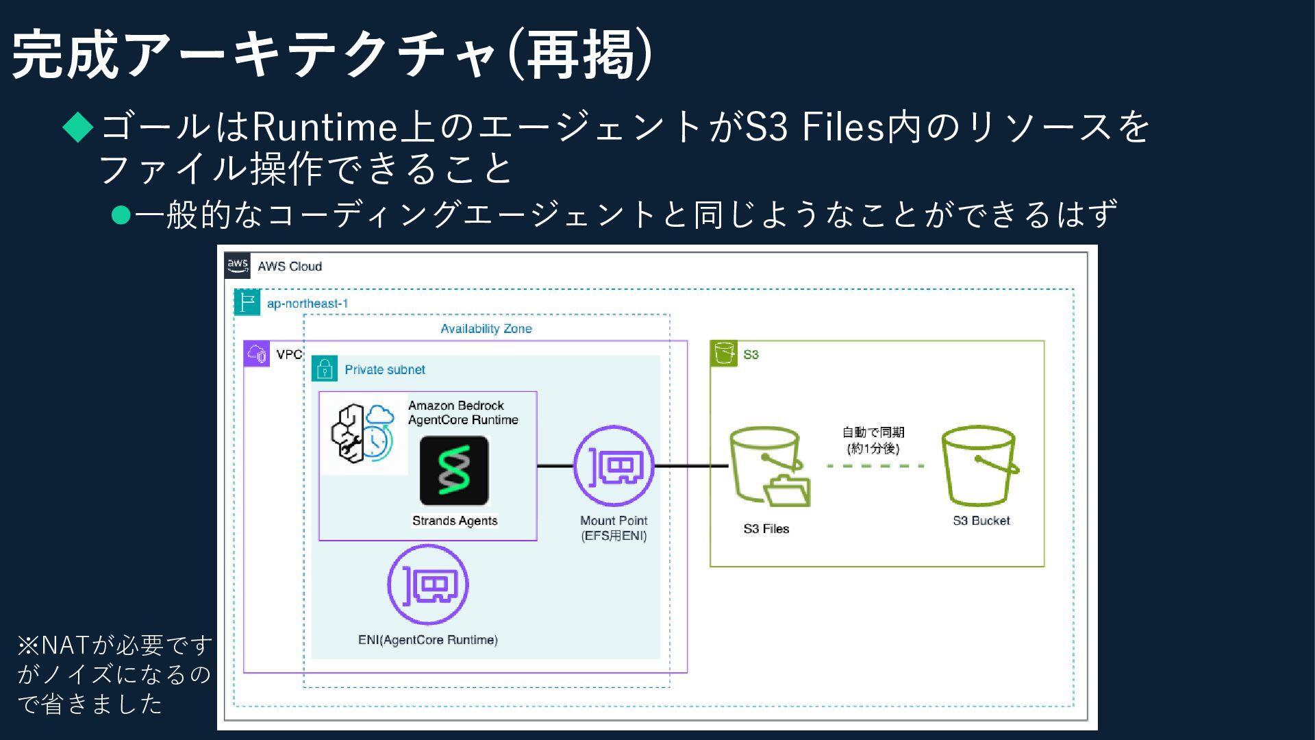 完成アーキテクチャ(再掲) ◆ゴールはRuntime上のエージェントがS3 Files内のリソースを ファイル操作できること ⚫一般的なコーディングエージェントと同じようなことができるはず ※NATが必要です がノイズになるの で省きました