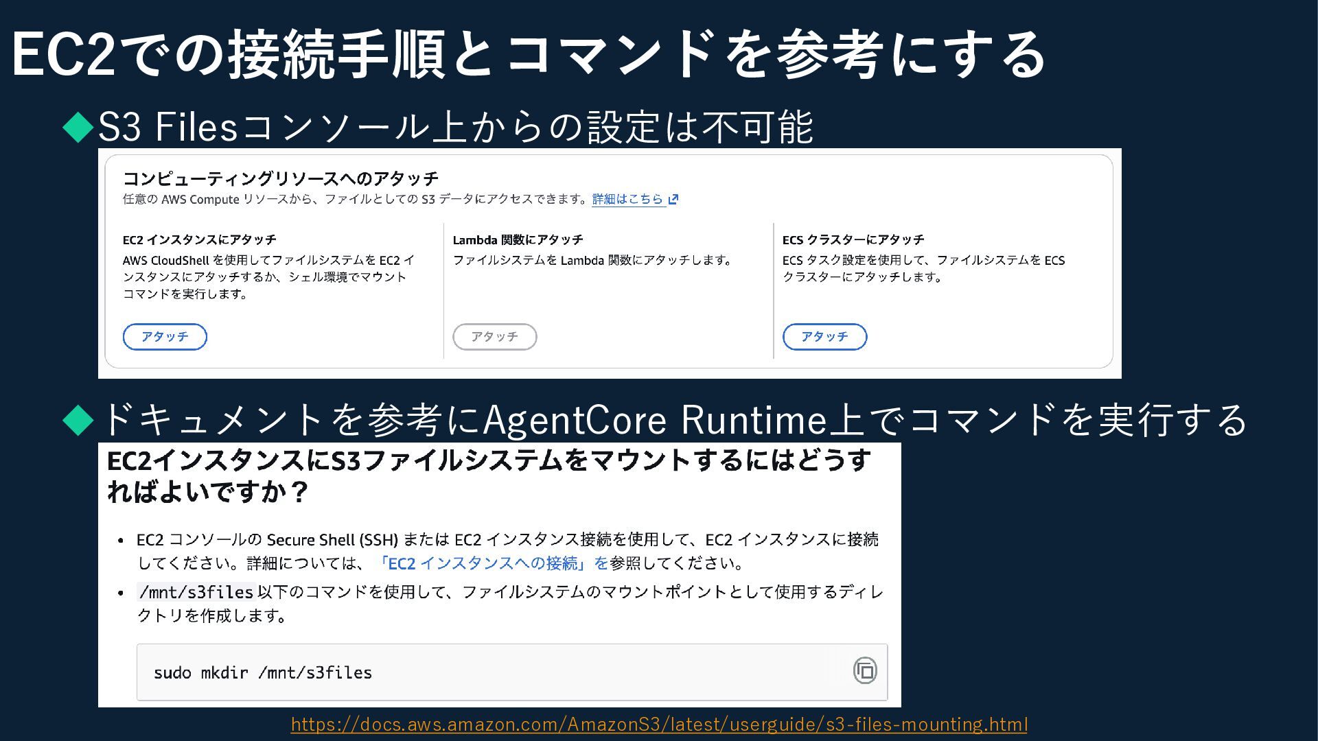 EC2での接続手順とコマンドを参考にする ◆S3 Filesコンソール上からの設定は不可能 ◆ドキュメントを参考にAgentCore Runtime上でコマンドを実行する https://docs.aws.amazon.com/AmazonS3/latest/userguide/s3-files-mounting.html