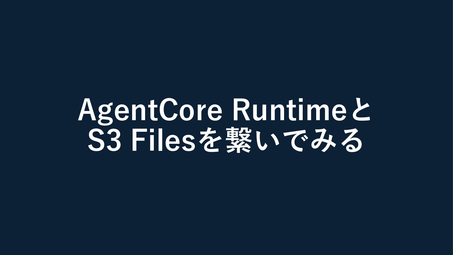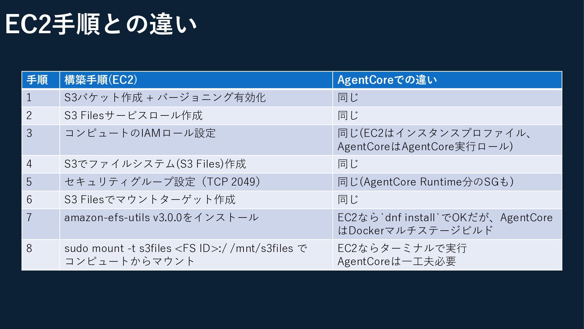 S3 Filesサービスロール作成 同じ 3 コンピュートのIAMロール設定 同じ(EC2はインスタンスプロファイル、 AgentCoreはAgentCore実行ロール) 4 S3でファイルシステム(S3 Files)作成 同じ 5 セキュリティグループ設定(TCP 2049) 同じ(AgentCore Runtime分のSGも) 6 S3 Filesでマウントターゲット作成 同じ 7 amazon-efs-utils v3.0.0をインストール EC2なら`dnf install`でOKだが、AgentCore はDockerマルチステージビルド 8 sudo mount -t s3files <FS ID>:/ /mnt/s3files で コンピュートからマウント EC2ならターミナルで実行 AgentCoreは一工夫必要
