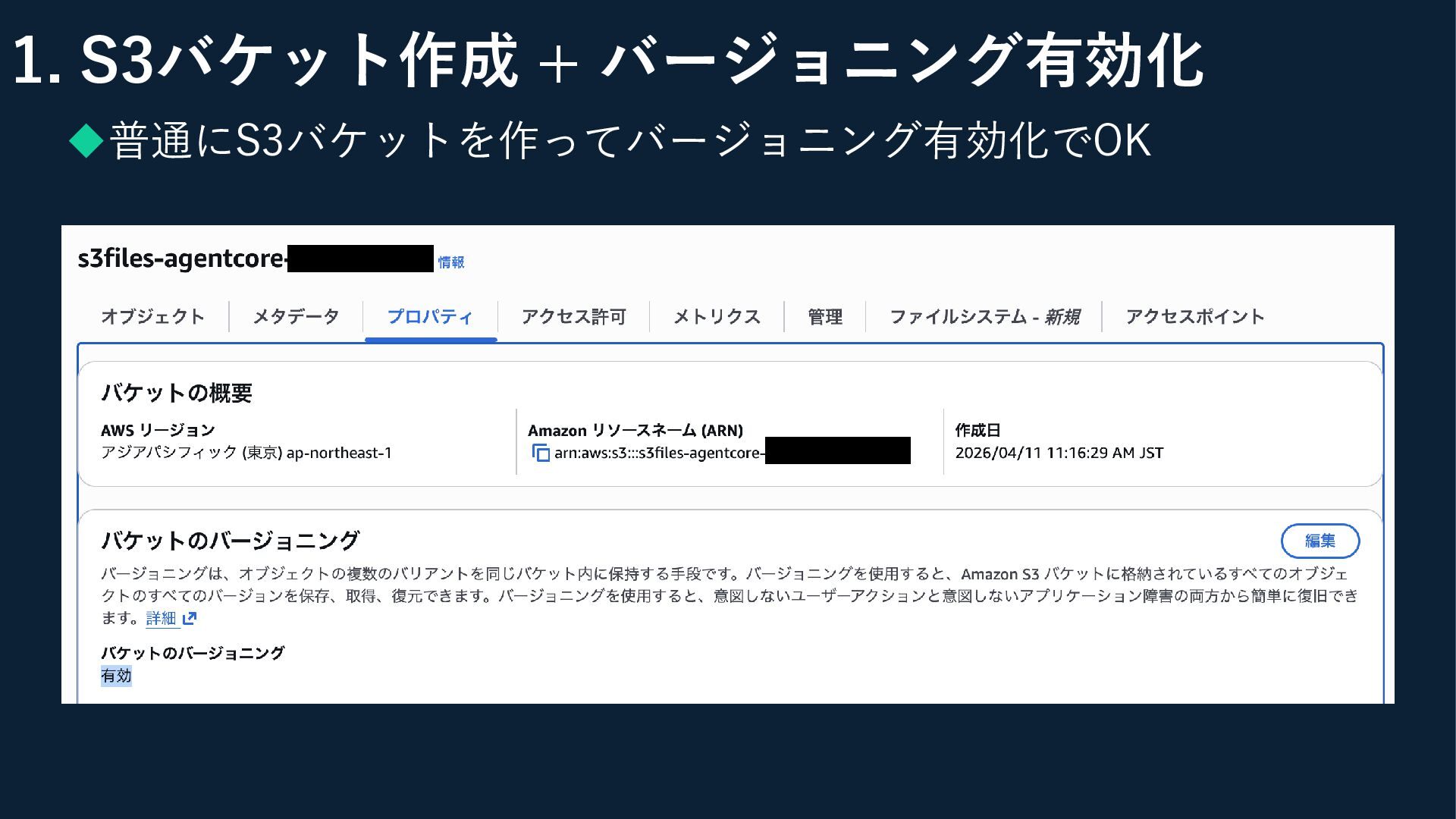 EC2手順との違い 手順 構築手順(EC2) AgentCoreでの違い 1 S3バケット作成 + バージョニング有効化 同じ 2