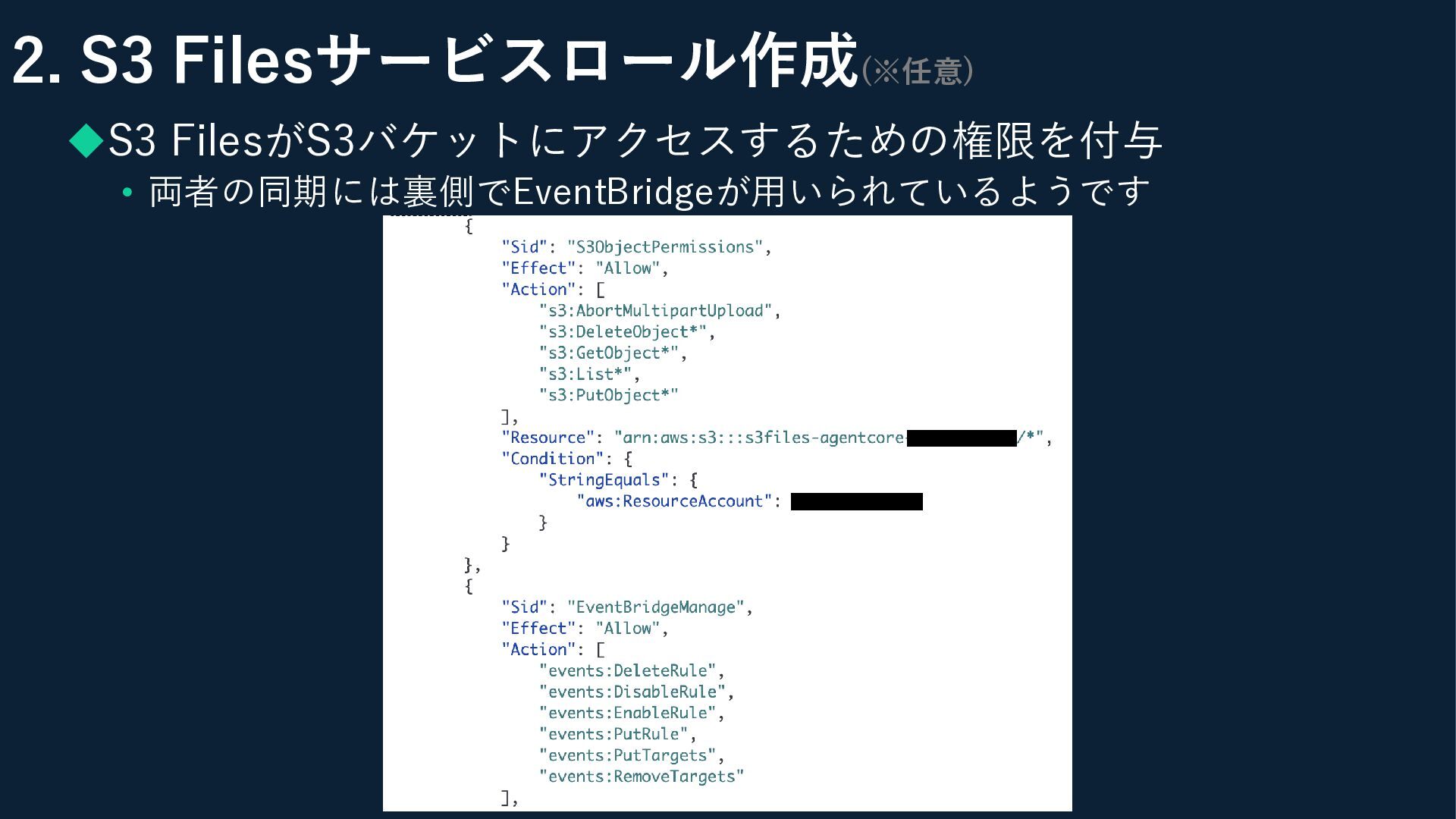 2. S3 Filesサービスロール作成(※任意) ◆S3 FilesがS3バケットにアクセスするための権限を付与 • 両者の同期には裏側でEventBridgeが用いられているようです