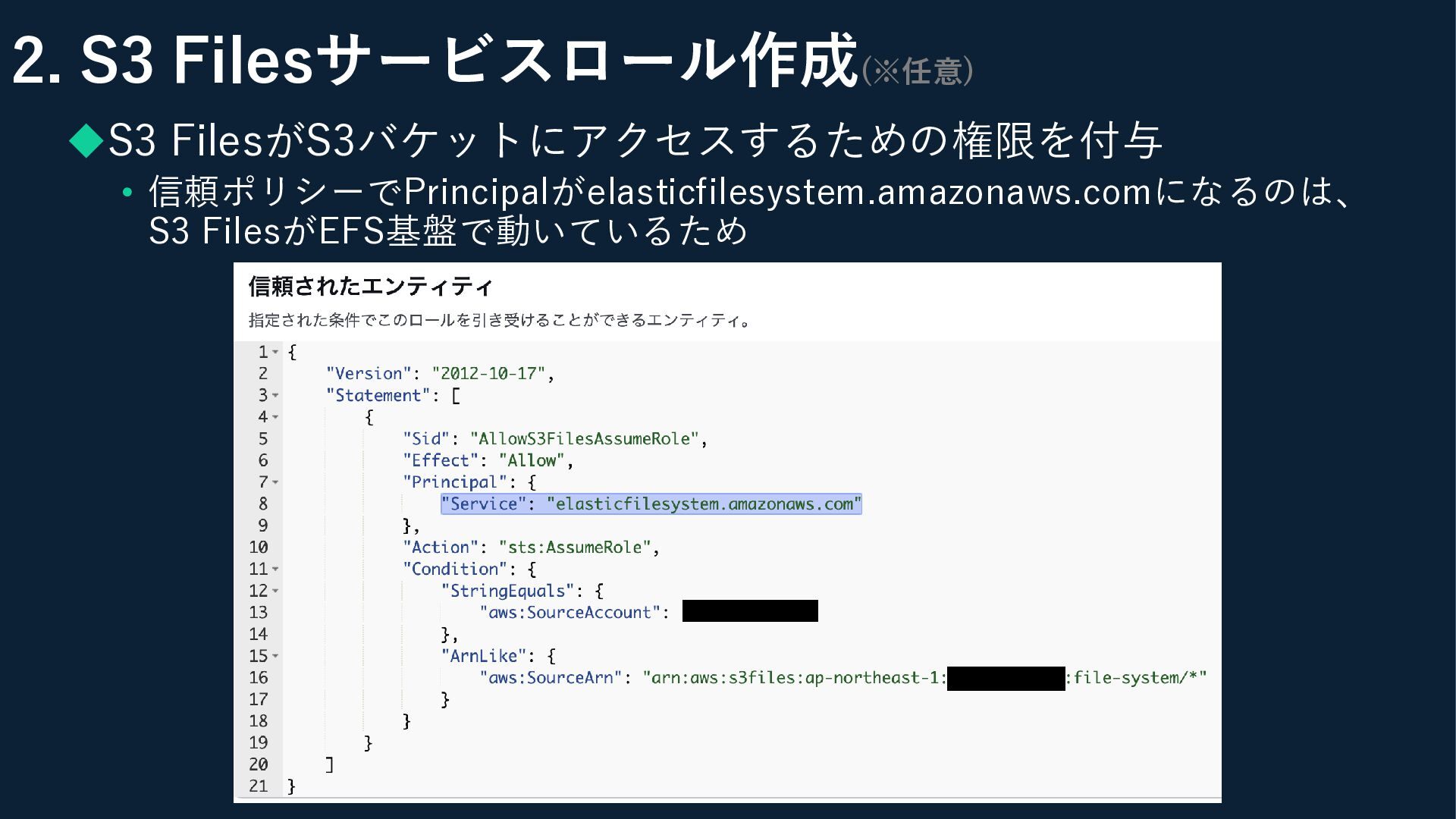 2. S3 Filesサービスロール作成(※任意) ◆S3 FilesがS3バケットにアクセスするための権限を付与 • 信頼ポリシーでPrincipalがelasticfilesystem.amazonaws.comになるのは、 S3 FilesがEFS基盤で動いているため