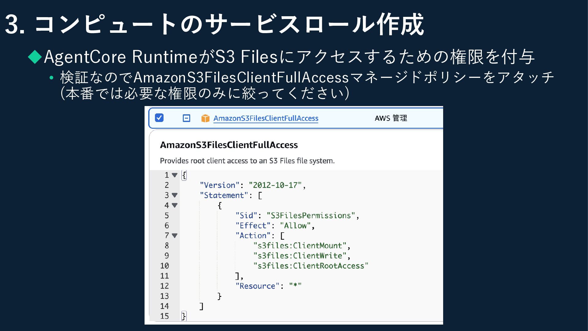 3. コンピュートのサービスロール作成 ◆AgentCore RuntimeがS3 Filesにアクセスするための権限を付与 • 検証なのでAmazonS3FilesClientFullAccessマネージドポリシーをアタッチ (本番では必要な権限のみに絞ってください)