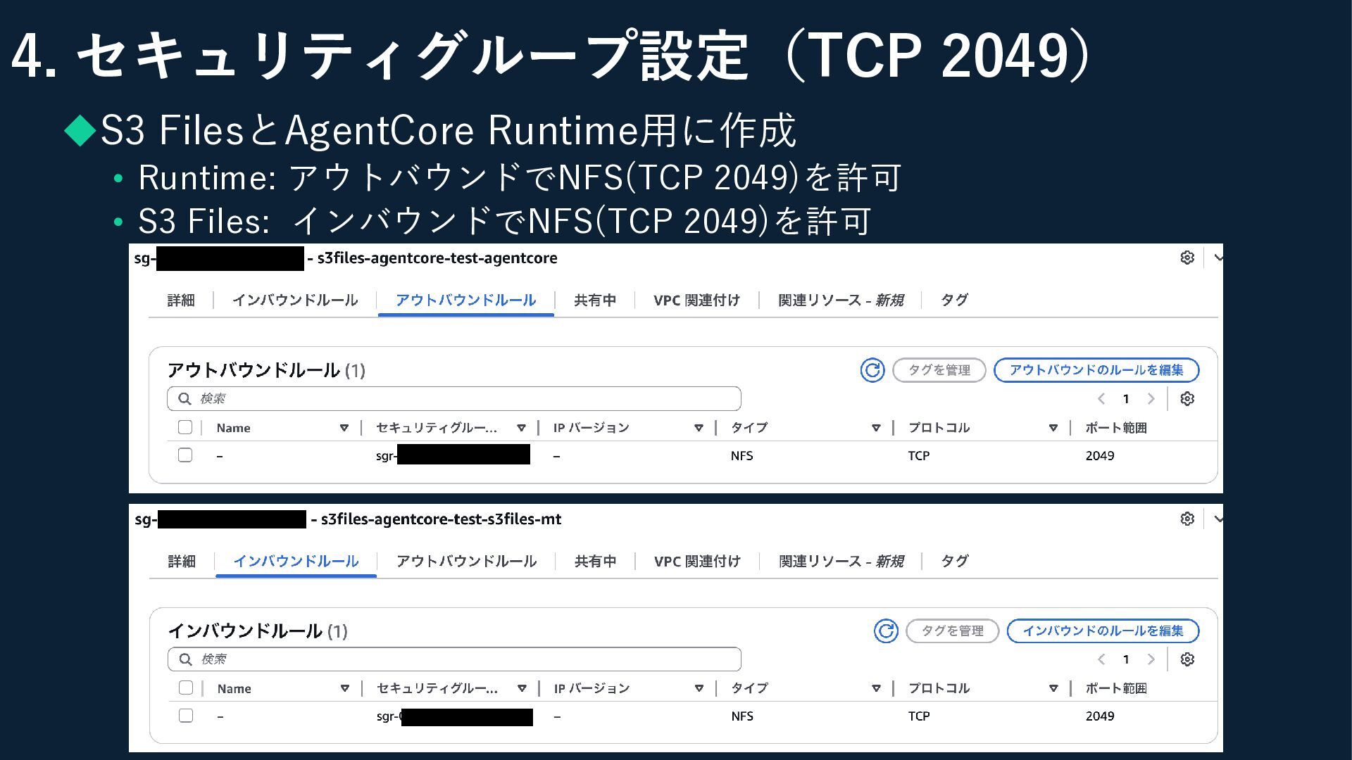 4. セキュリティグループ設定(TCP 2049) ◆S3 FilesとAgentCore Runtime用に作成 • Runtime: アウトバウンドでNFS(TCP 2049)を許可