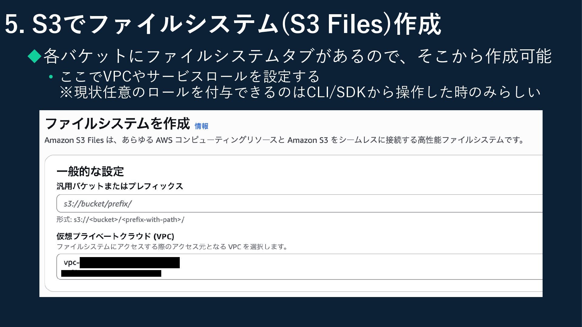 5. S3でファイルシステム(S3 Files)作成 ◆各バケットにファイルシステムタブがあるので、そこから作成可能 • ここでVPCやサービスロールを設定する ※現状任意のロールを付与できるのはCLI/SDKから操作した時のみらしい