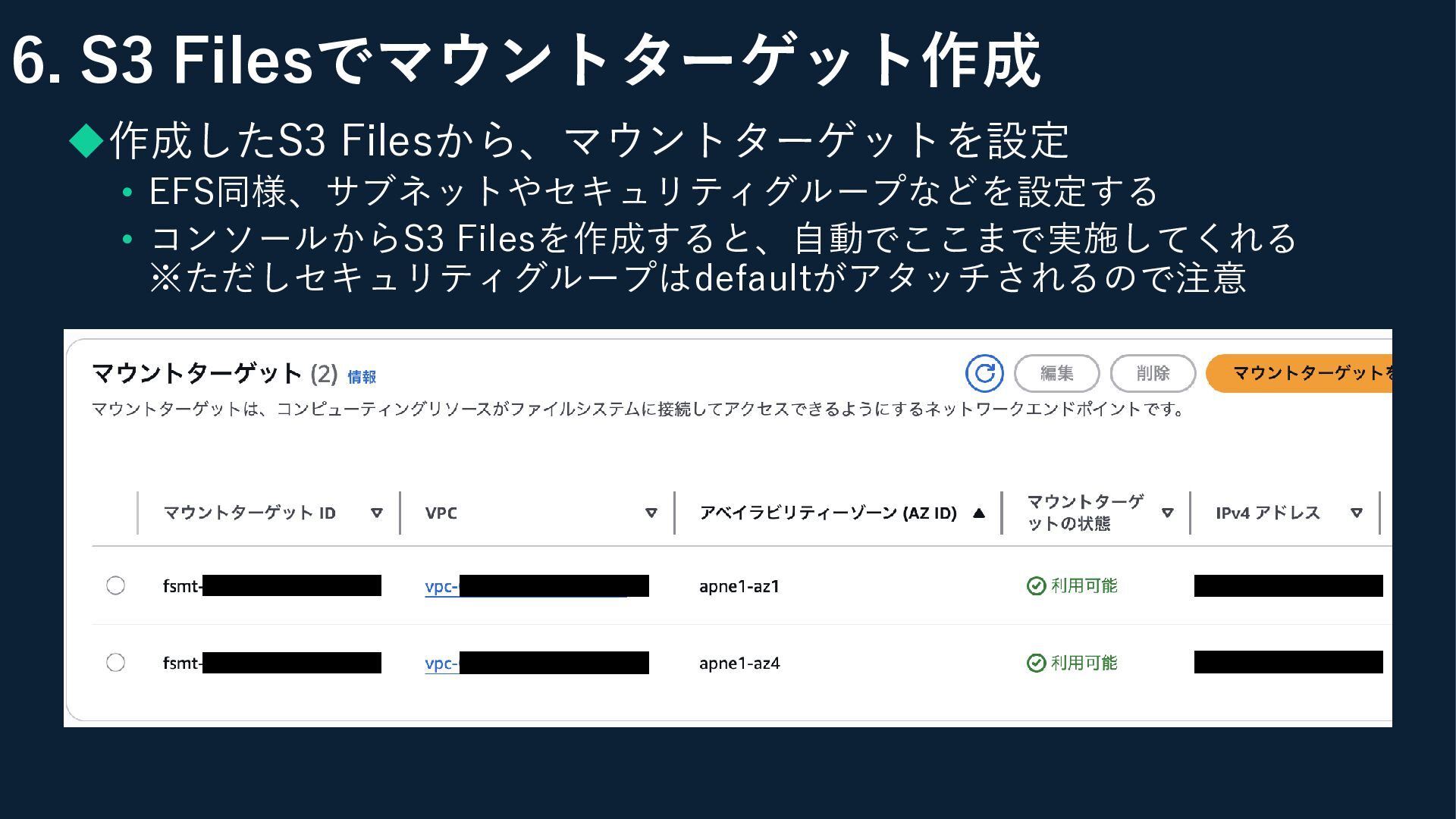 6. S3 Filesでマウントターゲット作成 ◆作成したS3 Filesから、マウントターゲットを設定 • EFS同様、サブネットやセキュリティグループなどを設定する • コンソールからS3 Filesを作成すると、自動でここまで実施してくれる