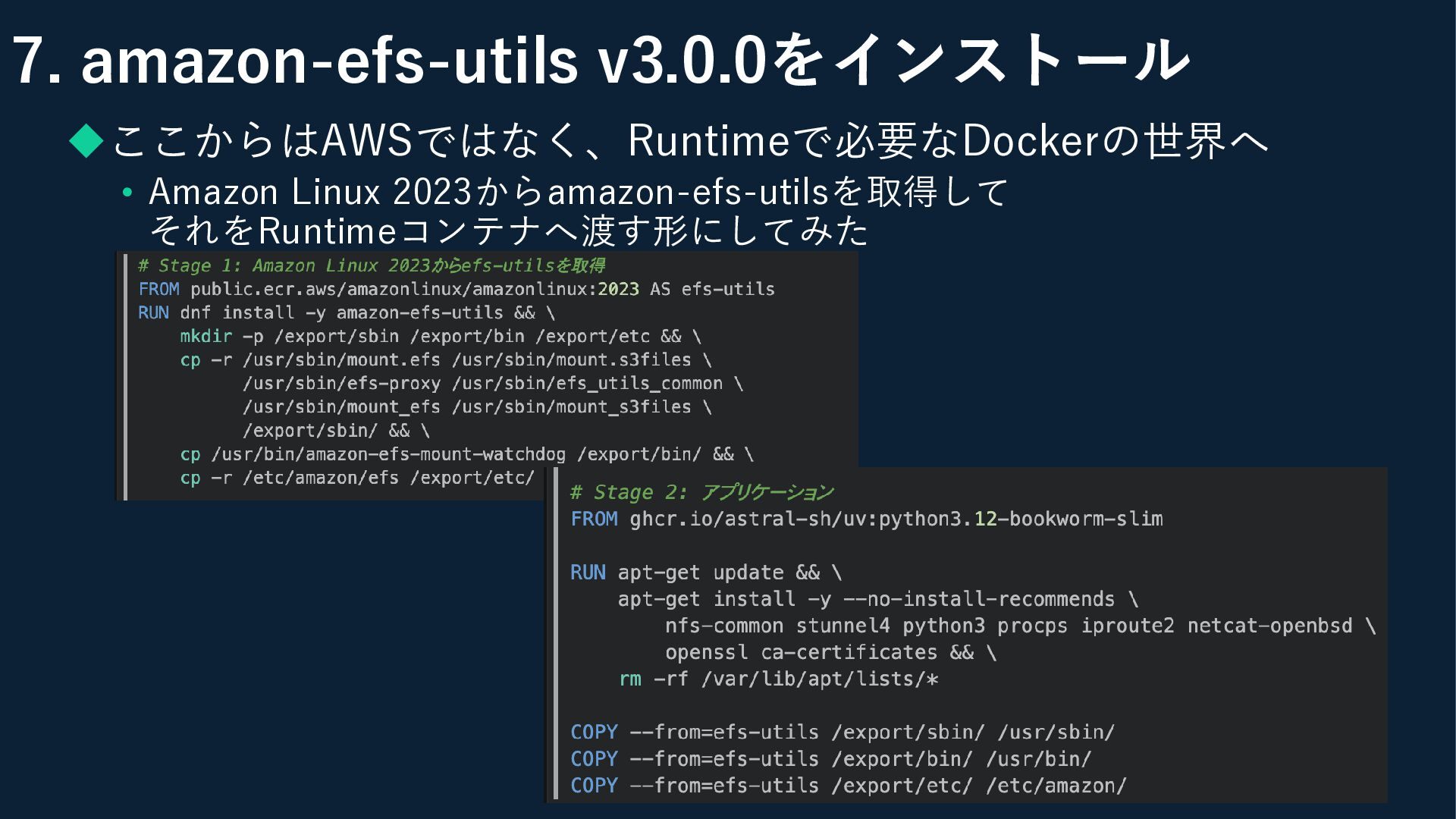 7. amazon-efs-utils v3.0.0をインストール ◆ここからはAWSではなく、Runtimeで必要なDockerの世界へ • Amazon Linux 2023からamazon-efs-utilsを取得して それをRuntimeコンテナへ渡す形にしてみた