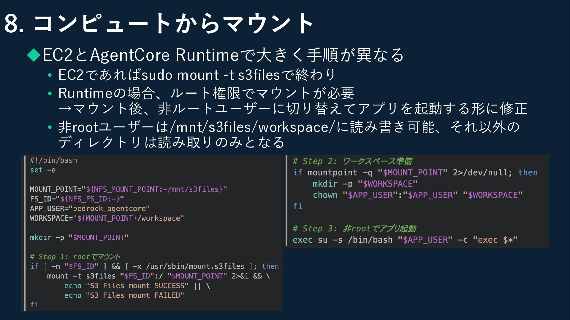 8. コンピュートからマウント ◆EC2とAgentCore Runtimeで大きく手順が異なる • EC2であればsudo mount -t s3filesで終わり •