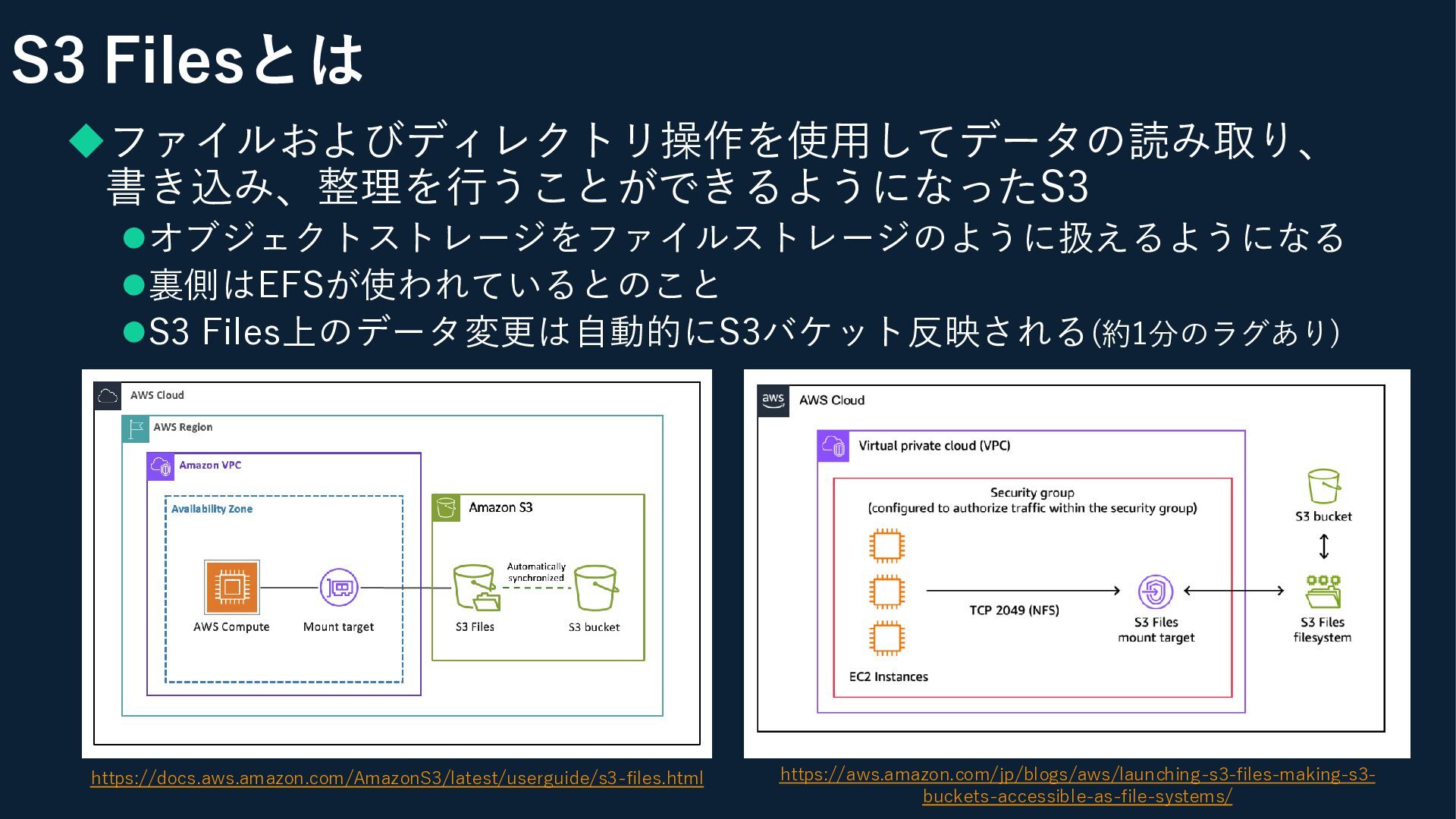 S3 Filesとは ◆ファイルおよびディレクトリ操作を使用してデータの読み取り、 書き込み、整理を行うことができるようになったS3 ⚫オブジェクトストレージをファイルストレージのように扱えるようになる ⚫裏側はEFSが使われているとのこと ⚫S3 Files上のデータ変更は自動的にS3バケット反映される(約1分のラグあり) https://docs.aws.amazon.com/AmazonS3/latest/userguide/s3-files.html https://aws.amazon.com/jp/blogs/aws/launching-s3-files-making-s3-