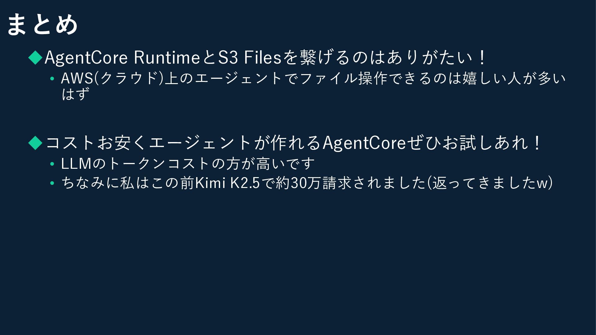 まとめ ◆AgentCore RuntimeとS3 Filesを繋げるのはありがたい! • AWS(クラウド)上のエージェントでファイル操作できるのは嬉しい人が多い はず ◆コストお安くエージェントが作れるAgentCoreぜひお試しあれ! • LLMのトークンコストの方が高いです