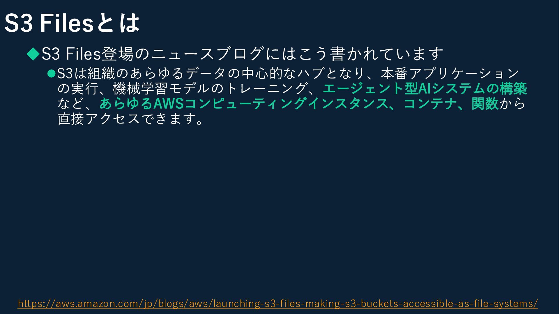 S3 Filesとは ◆S3 Files登場のニュースブログにはこう書かれています ⚫S3は組織のあらゆるデータの中心的なハブとなり、本番アプリケーション の実行、機械学習モデルのトレーニング、エージェント型AIシステムの構築 など、あらゆるAWSコンピューティングインスタンス、コンテナ、関数から 直接アクセスできます。 https://aws.amazon.com/jp/blogs/aws/launching-s3-files-making-s3-buckets-accessible-as-file-systems/