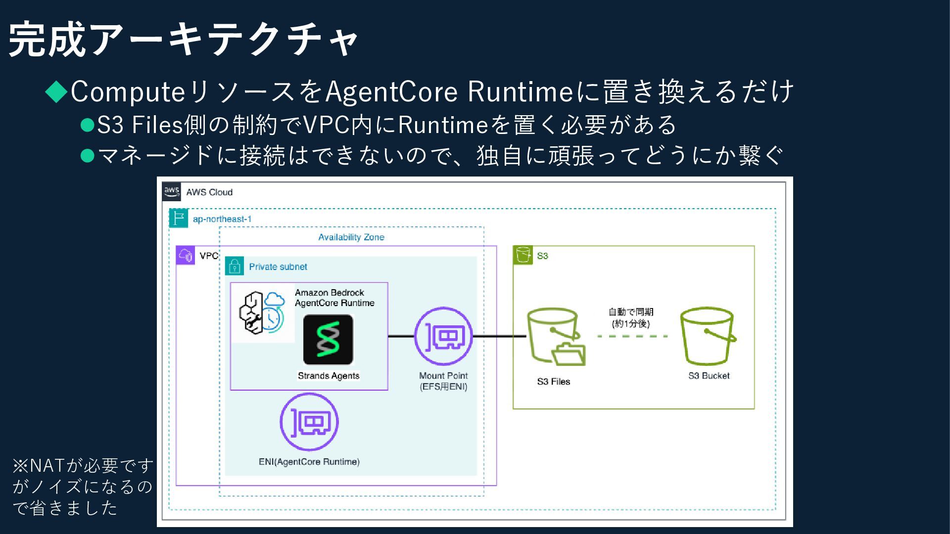 完成アーキテクチャ ◆ComputeリソースをAgentCore Runtimeに置き換えるだけ ⚫S3 Files側の制約でVPC内にRuntimeを置く必要がある ⚫マネージドに接続はできないので、独自に頑張ってどうにか繋ぐ ※NATが必要です がノイズになるの で省きました