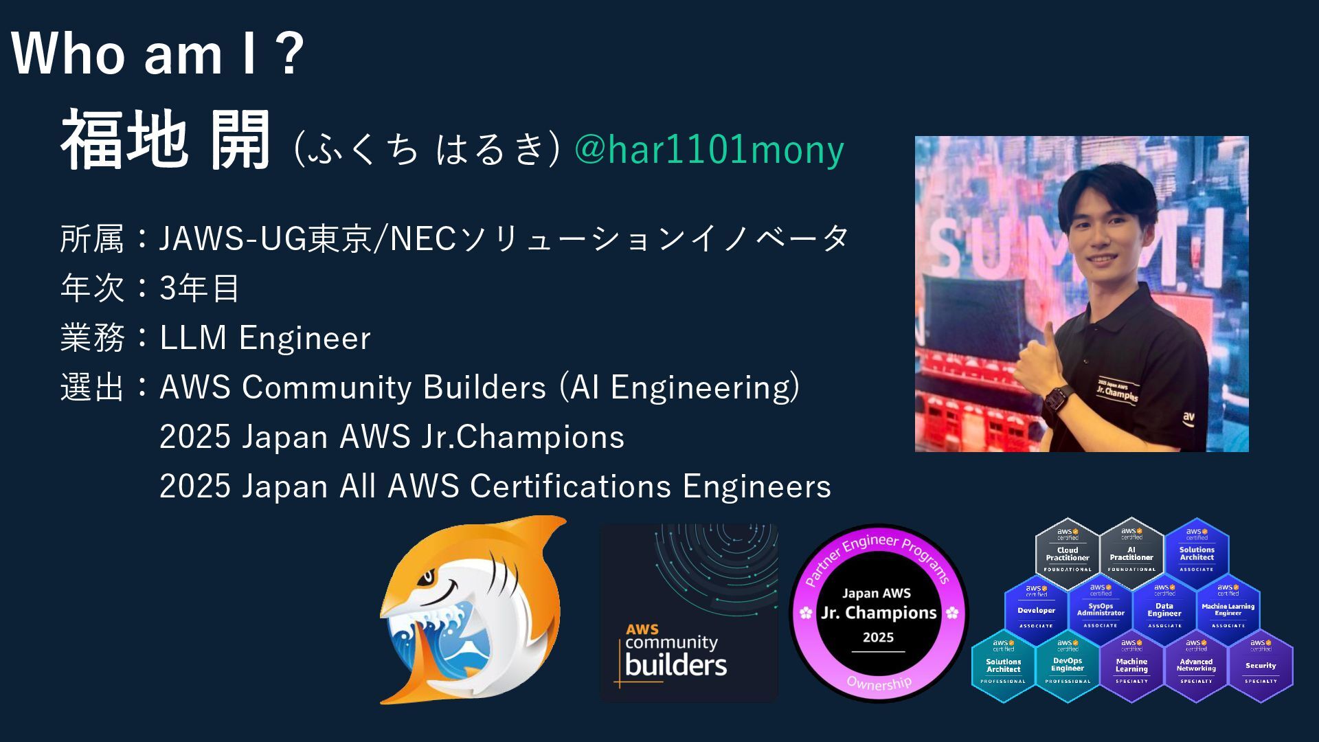 年次:3年目 業務:LLM Engineer 選出:AWS Community Builders (AI Engineering) 2025 Japan AWS Jr.Champions 2025 Japan All AWS Certifications Engineers
