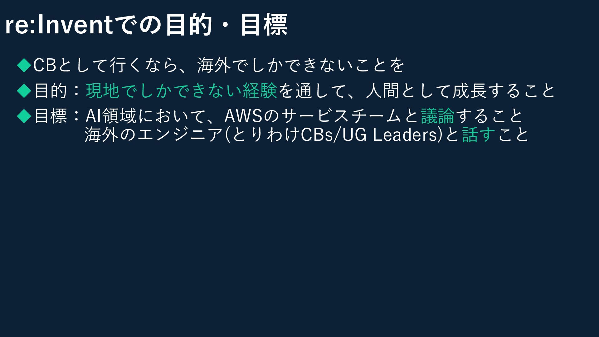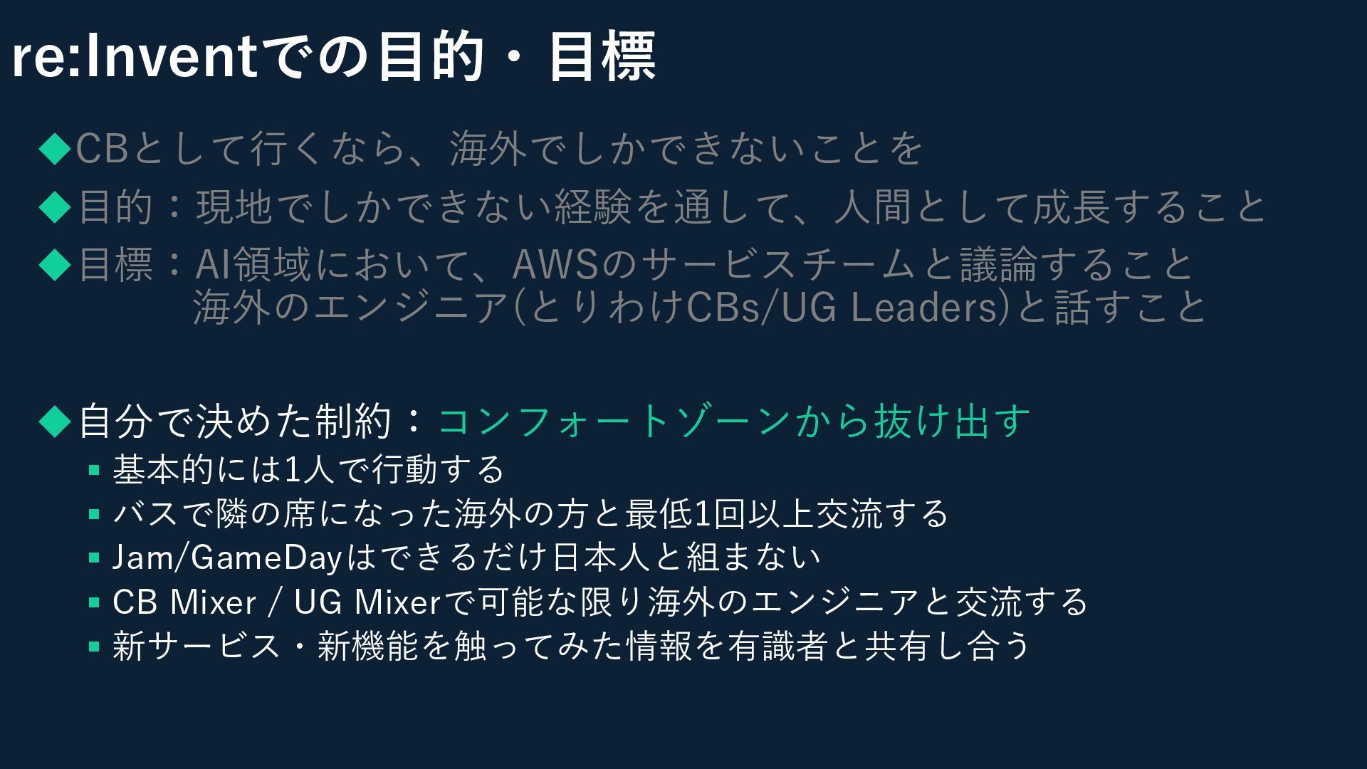 re:Inventでの目的・目標 ◆CBとして行くなら、海外でしかできないことを ◆目的:現地でしかできない経験を通して、人間として成長すること ◆目標:AI領域において、AWSのサービスチームと議論すること 海外のエンジニア(とりわけCBs/UG Leaders)と話すこと
