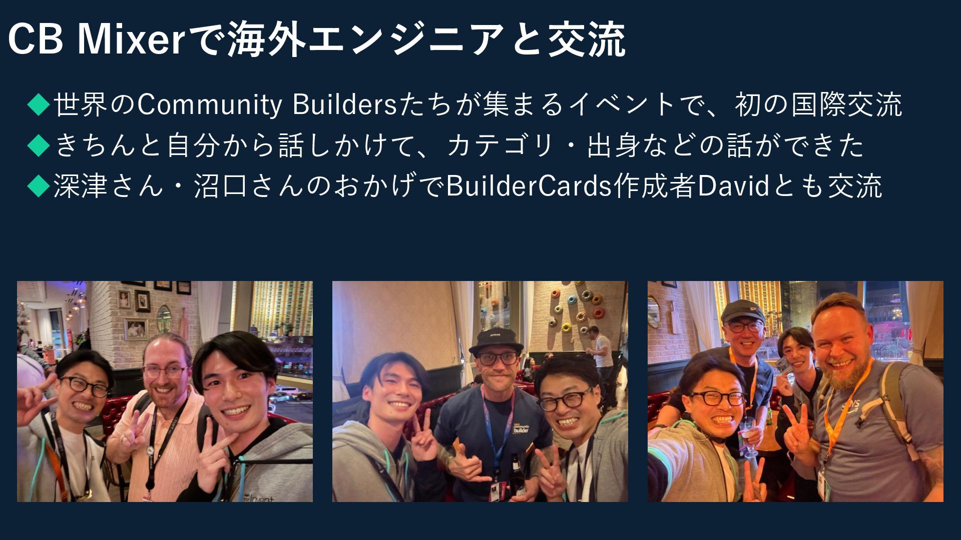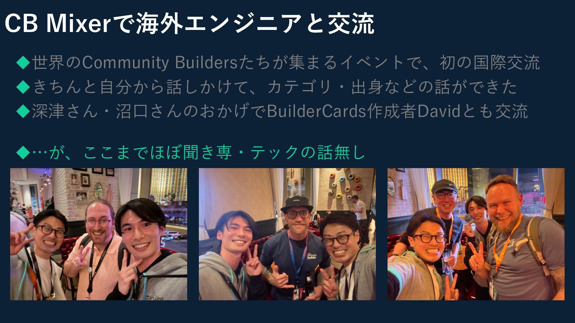 CB Mixerで海外エンジニアと交流 ◆世界のCommunity Buildersたちが集まるイベントで、初の国際交流 ◆きちんと自分から話しかけて、カテゴリ・出身などの話ができた ◆深津さん・沼口さんのおかげでBuilderCards作成者Davidとも交流 ◆…が、ここまでほぼ聞き専・テックの話無し