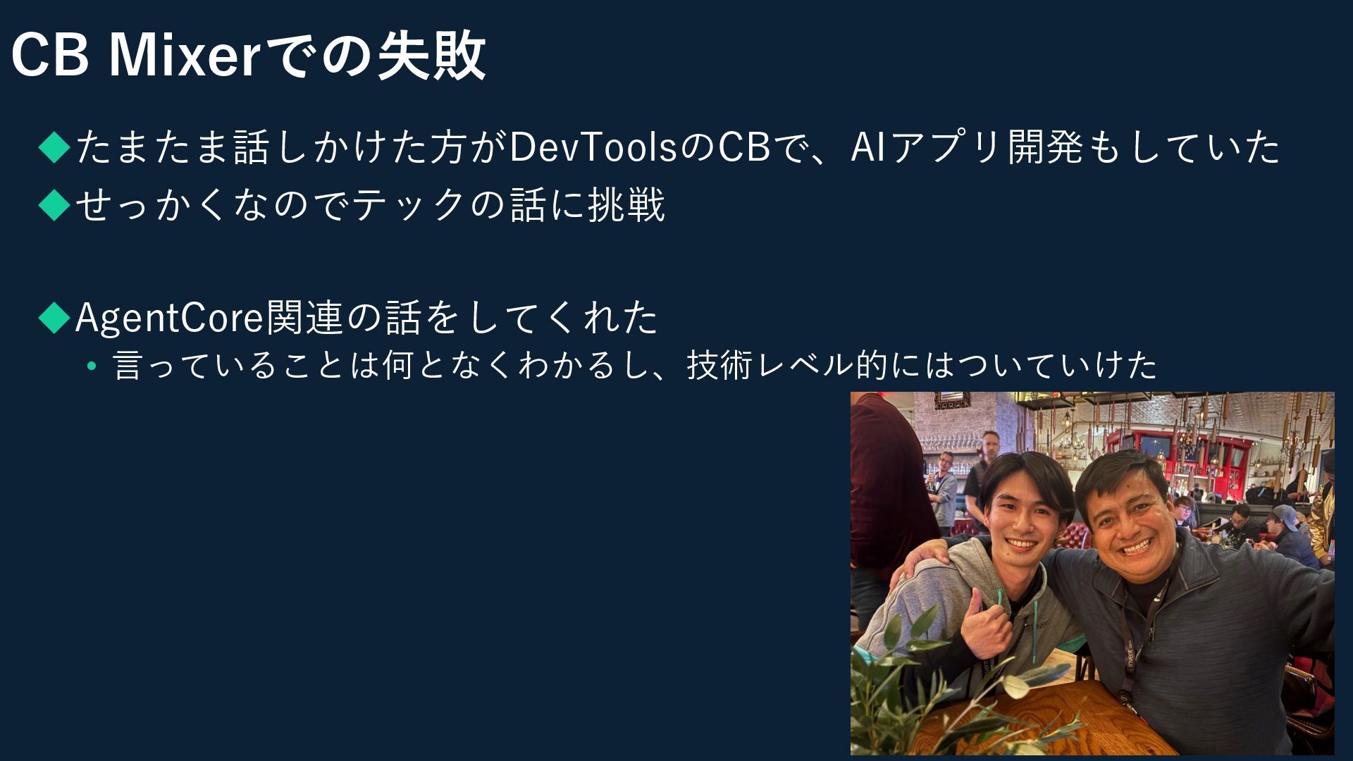 CB Mixerでの失敗 ◆たまたま話しかけた方がDevToolsのCBで、AIアプリ開発もしていた ◆せっかくなのでテックの話に挑戦 ◆AgentCore関連の話をしてくれた • 言っていることは何となくわかるし、技術レベル的にはついていけた