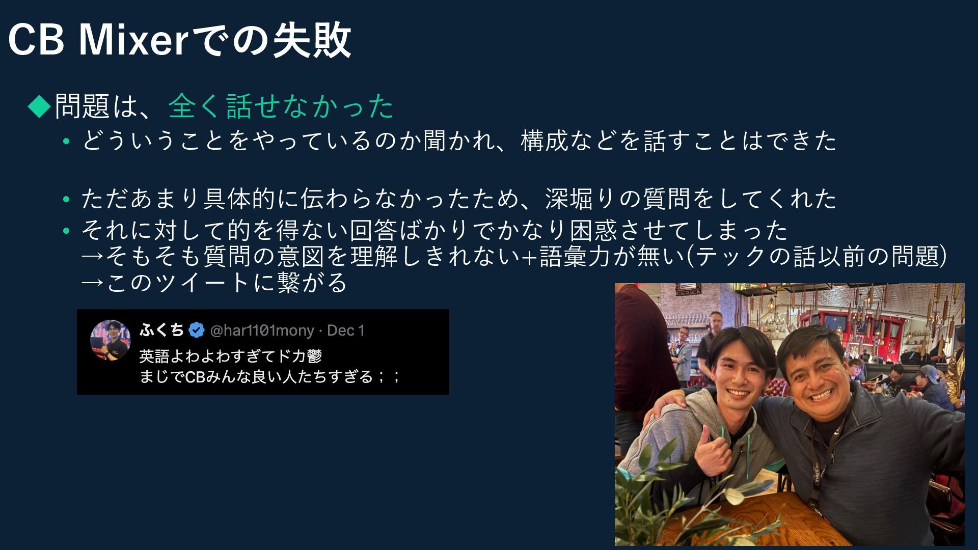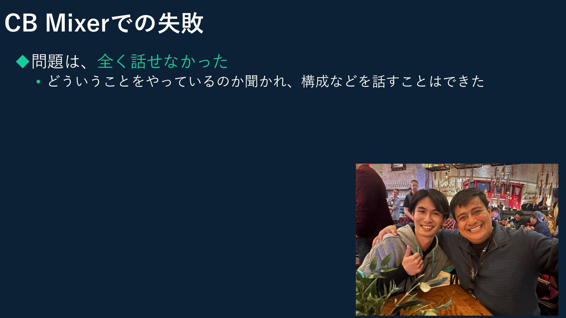 CB Mixerでの失敗 ◆問題は、全く話せなかった • どういうことをやっているのか聞かれ、構成などを話すことはできた