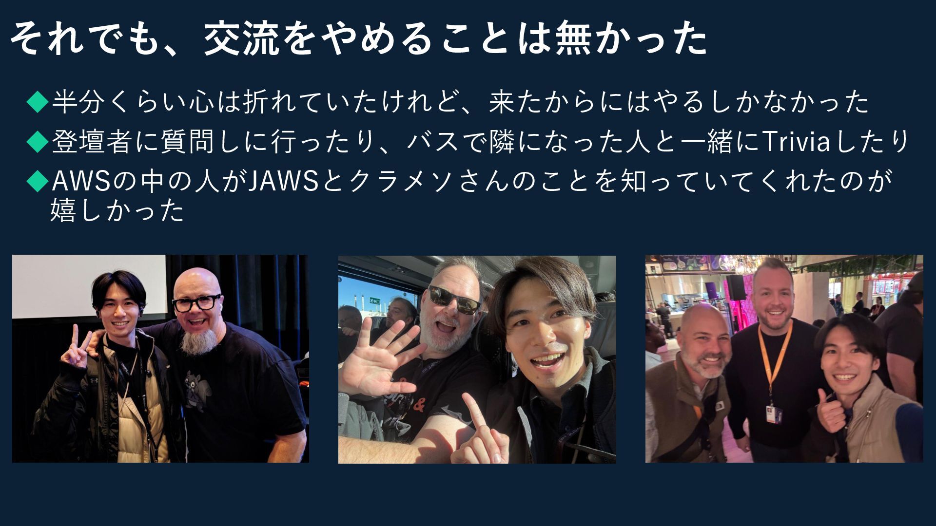 それでも、交流をやめることは無かった ◆半分くらい心は折れていたけれど、来たからにはやるしかなかった ◆登壇者に質問しに行ったり、バスで隣になった人と一緒にTriviaしたり ◆AWSの中の人がJAWSとクラメソさんのことを知っていてくれたのが 嬉しかった