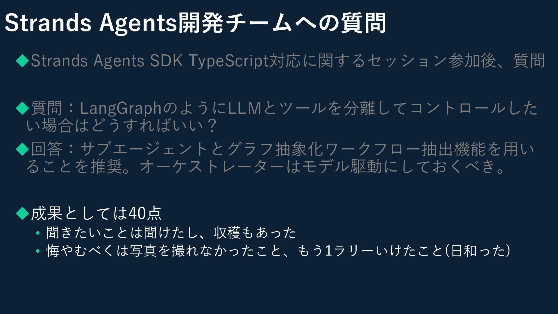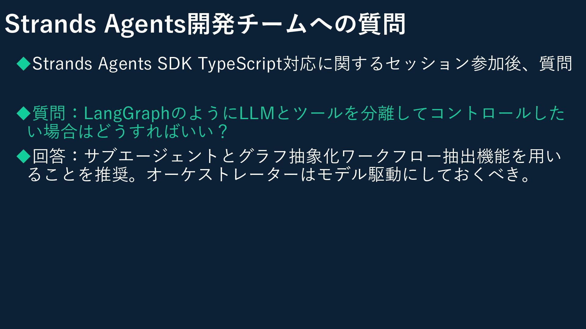 Strands Agents開発チームへの質問 ◆Strands Agents SDK TypeScript対応に関するセッション参加後、質問 ◆質問:LangGraphのようにLLMとツールを分離してコントロールした い場合はどうすればいい? ◆回答:サブエージェントとグラフ抽象化ワークフロー抽出機能を用い ることを推奨。オーケストレーターはモデル駆動にしておくべき。