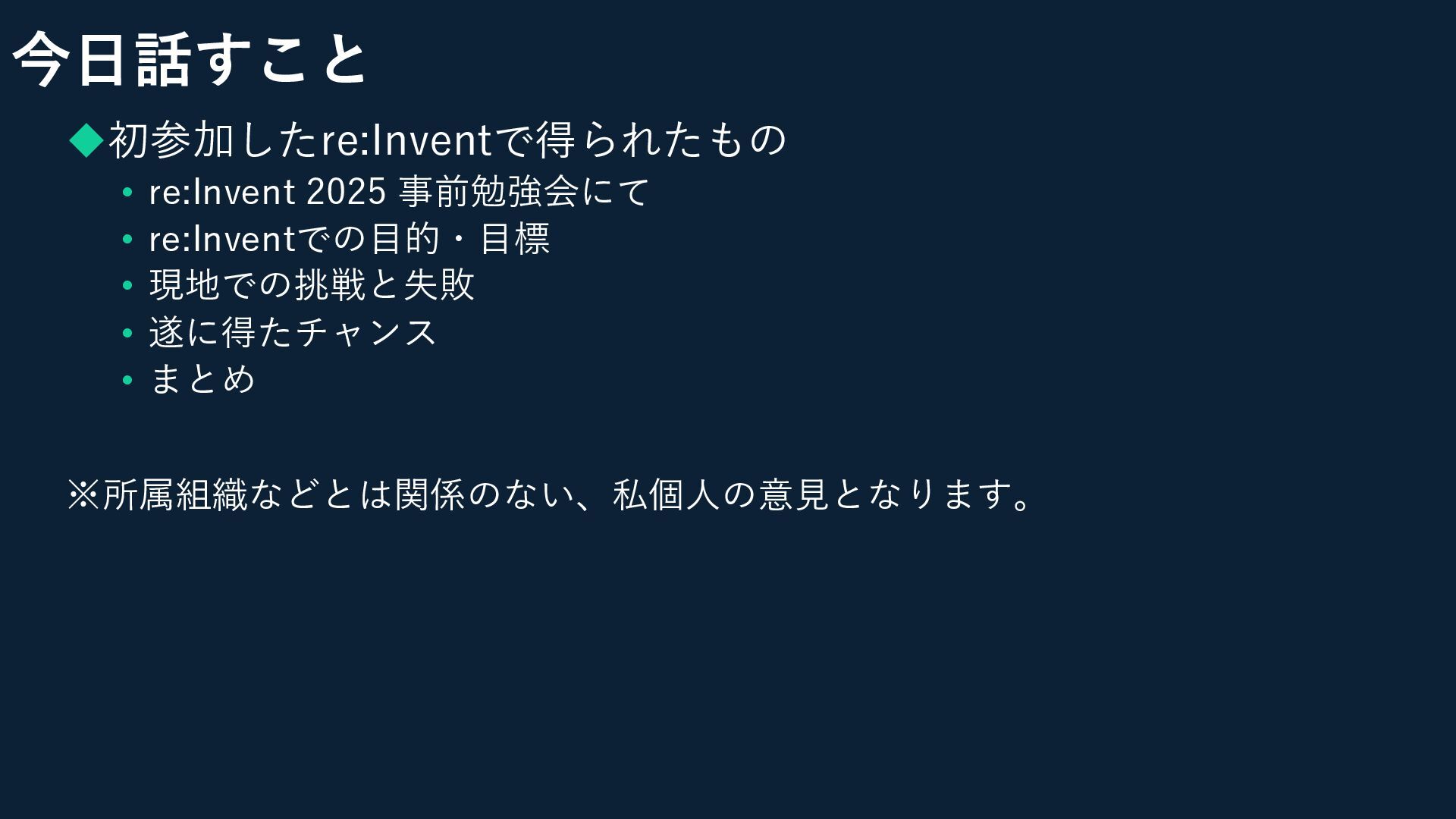 今日話すこと ◆初参加したre:Inventで得られたもの • re:Invent 2025 事前勉強会にて • re:Inventでの目的・目標 • 現地での挑戦と失敗
