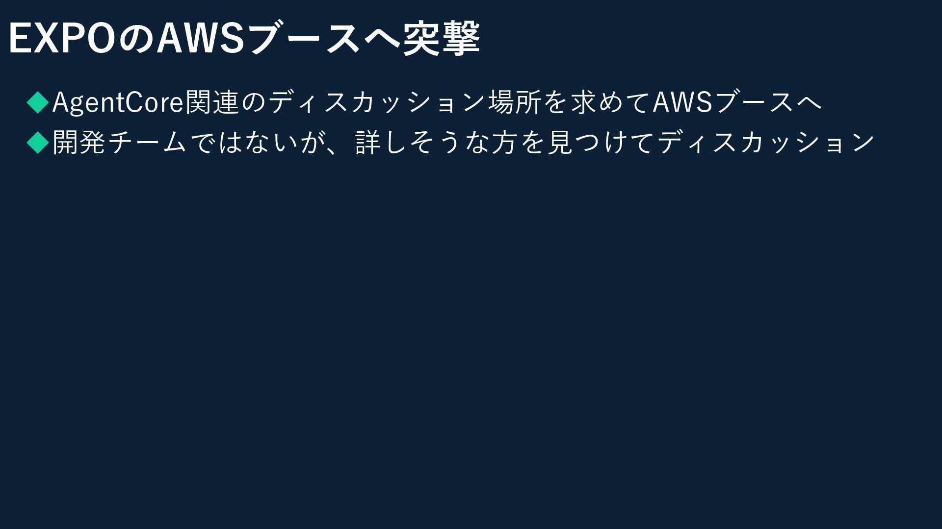 EXPOのAWSブースへ突撃 ◆AgentCore関連のディスカッション場所を求めてAWSブースへ ◆開発チームではないが、詳しそうな方を見つけてディスカッション