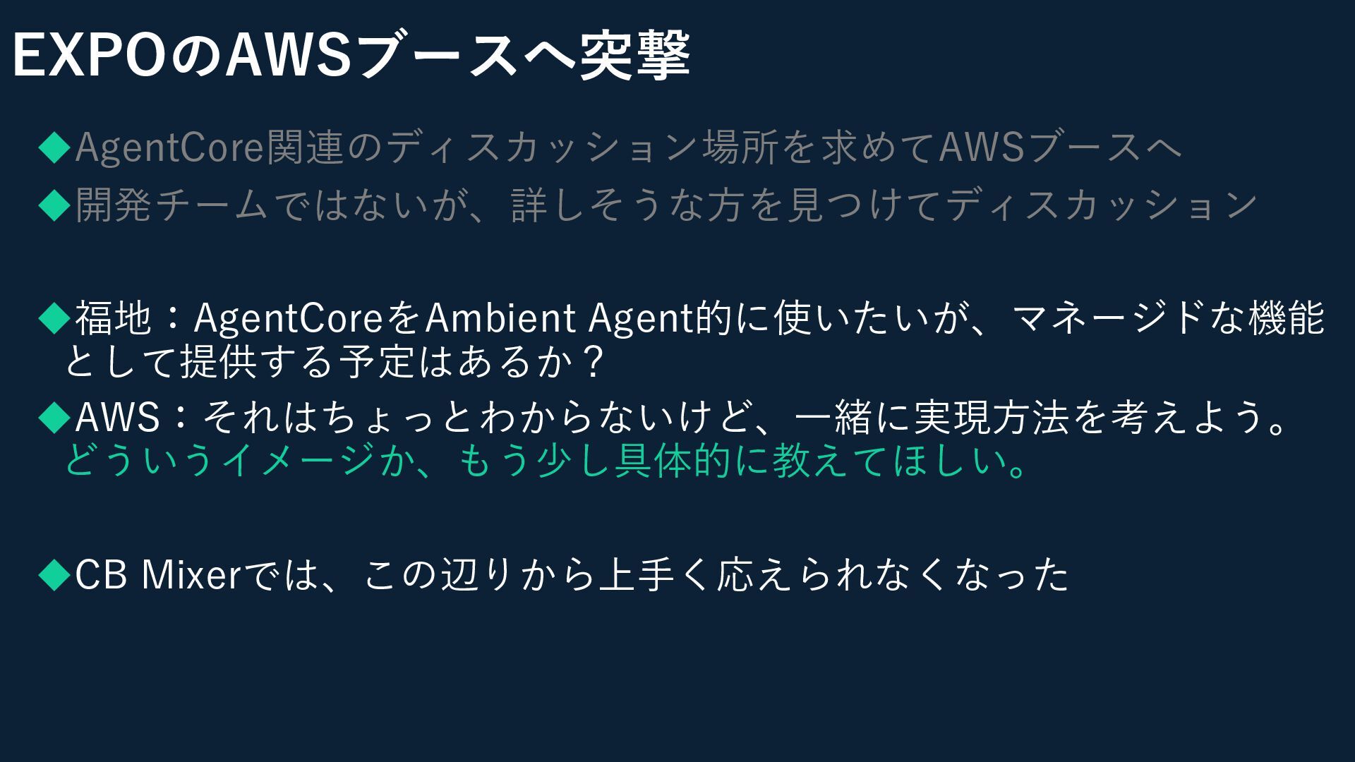 EXPOのAWSブースへ突撃 ◆AgentCore関連のディスカッション場所を求めてAWSブースへ ◆開発チームではないが、詳しそうな方を見つけてディスカッション ◆福地:AgentCoreをAmbient Agent的に使いたいが、マネージドな機能 として提供する予定はあるか? ◆AWS:それはちょっとわからないけど、一緒に実現方法を考えよう。 どういうイメージか、もう少し具体的に教えてほしい。 ◆CB Mixerでは、この辺りから上手く応えられなくなった