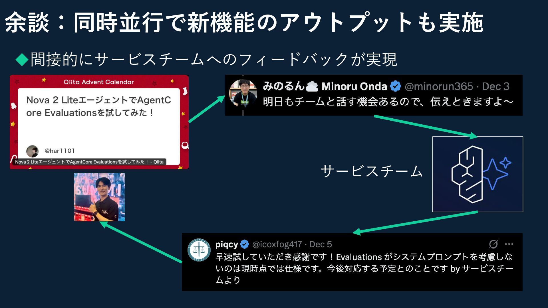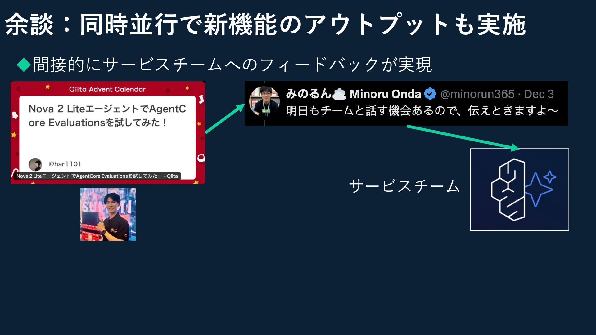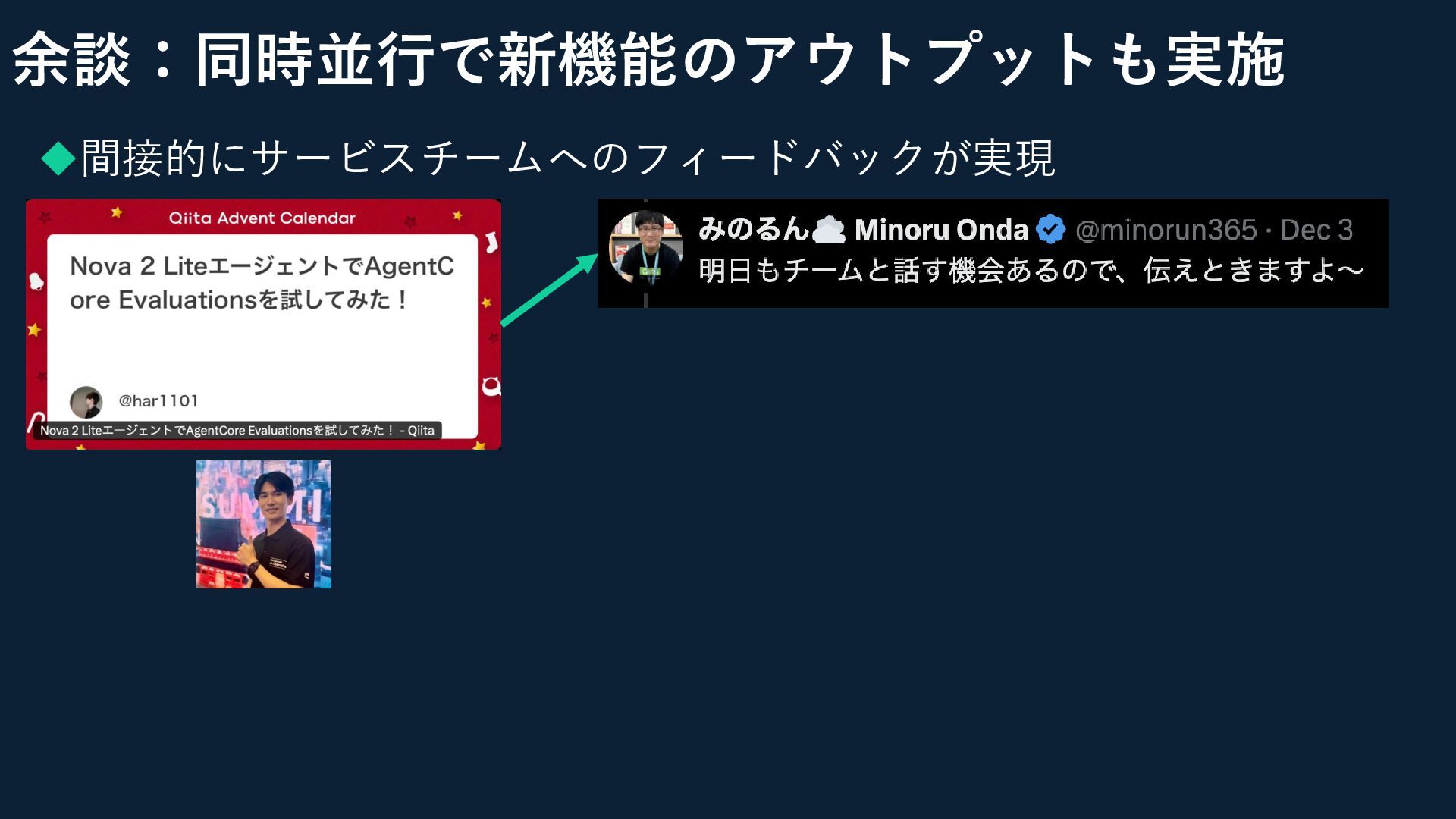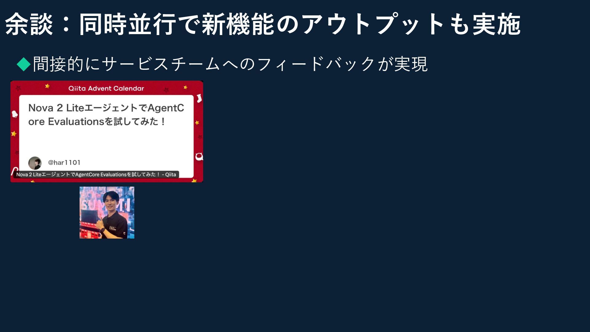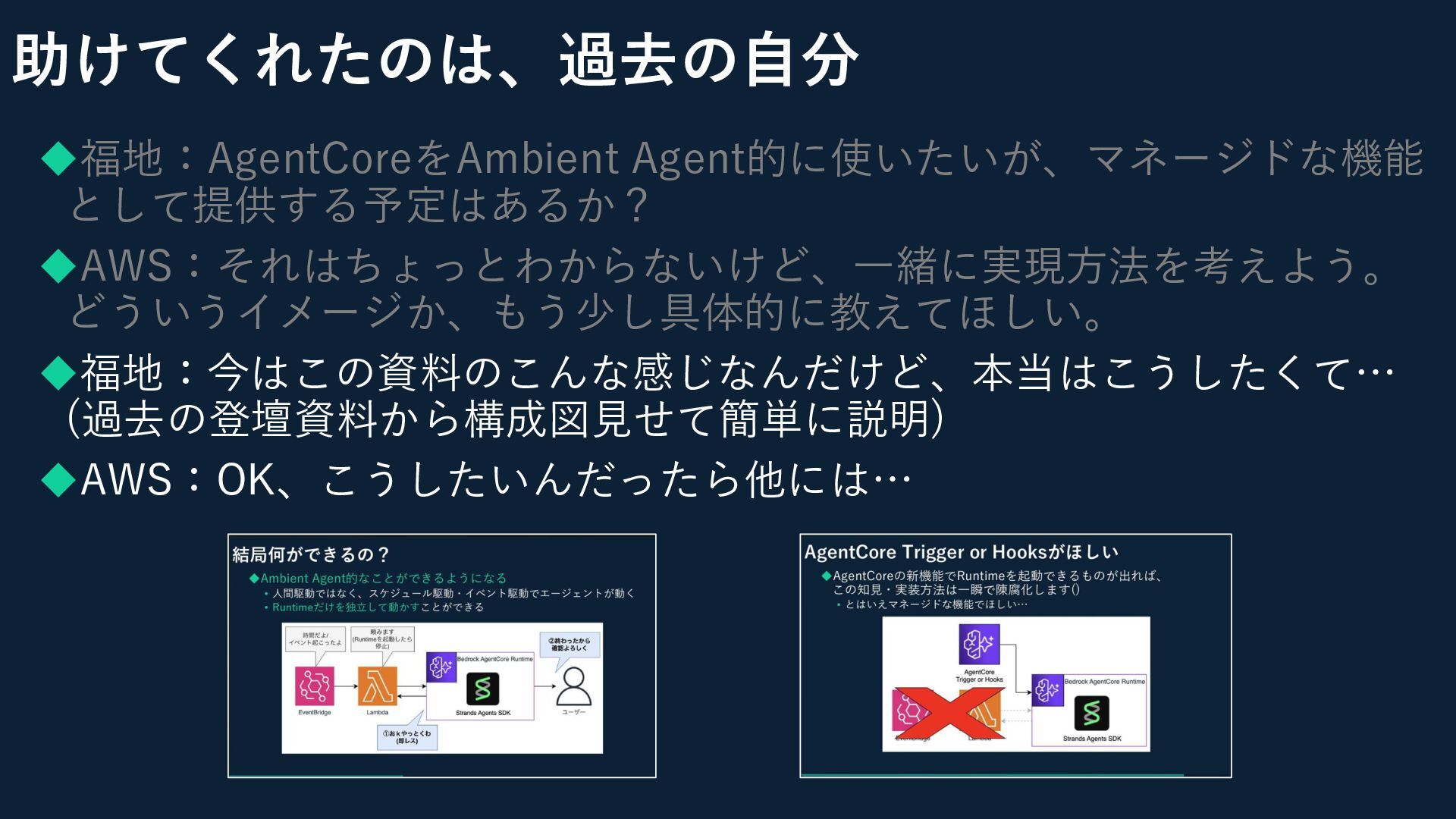 助けてくれたのは、過去の自分 ◆福地:AgentCoreをAmbient Agent的に使いたいが、マネージドな機能 として提供する予定はあるか? ◆AWS:それはちょっとわからないけど、一緒に実現方法を考えよう。 どういうイメージか、もう少し具体的に教えてほしい。 ◆福地:今はこの資料のこんな感じなんだけど、本当はこうしたくて… (過去の登壇資料から構成図見せて簡単に説明) ◆AWS:OK、こうしたいんだったら他には…