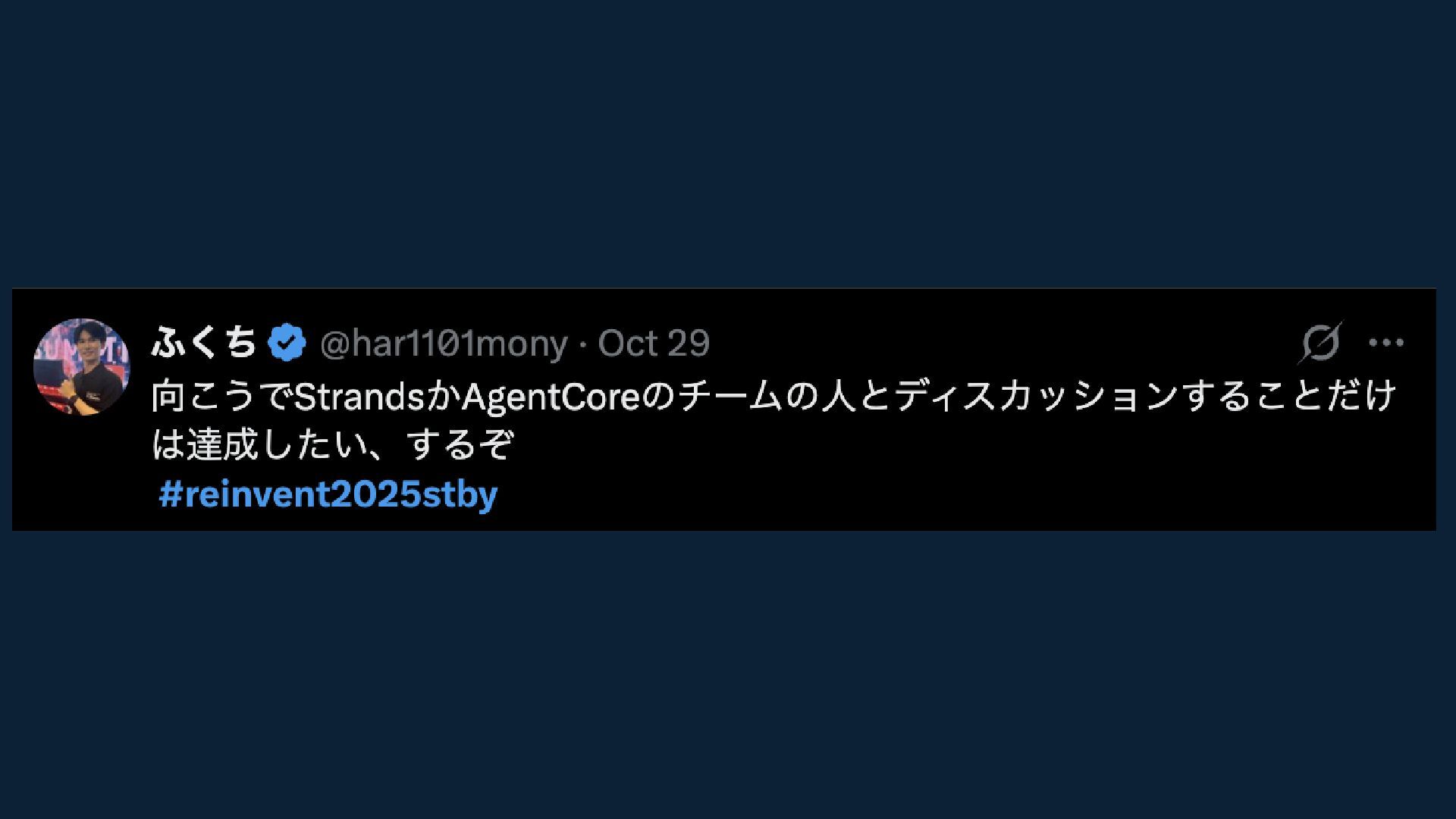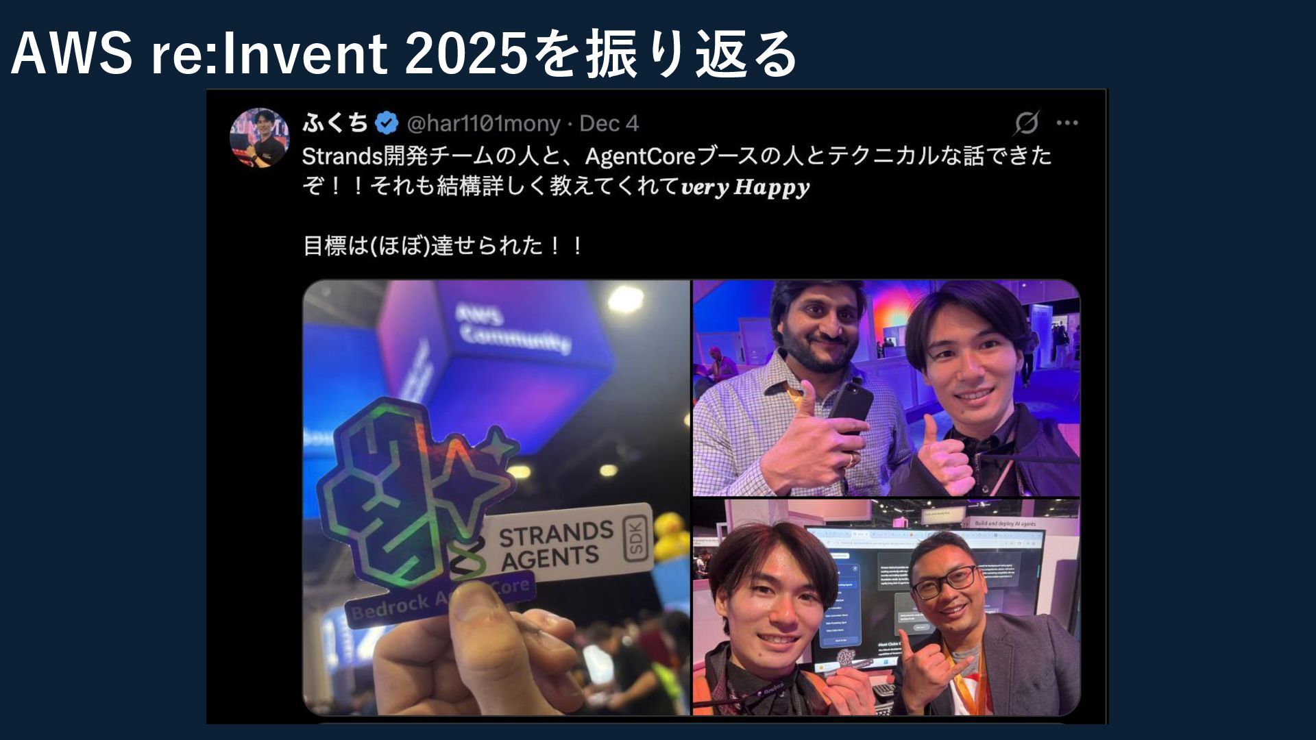 ◆個人的には収穫あり・失敗ありだけど満足のいく初re:Invent • とはいえやり残したことだらけ • 来年も絶対に行く ◆AWS re:Invent 2025はまだ終わらない • 学びの共有