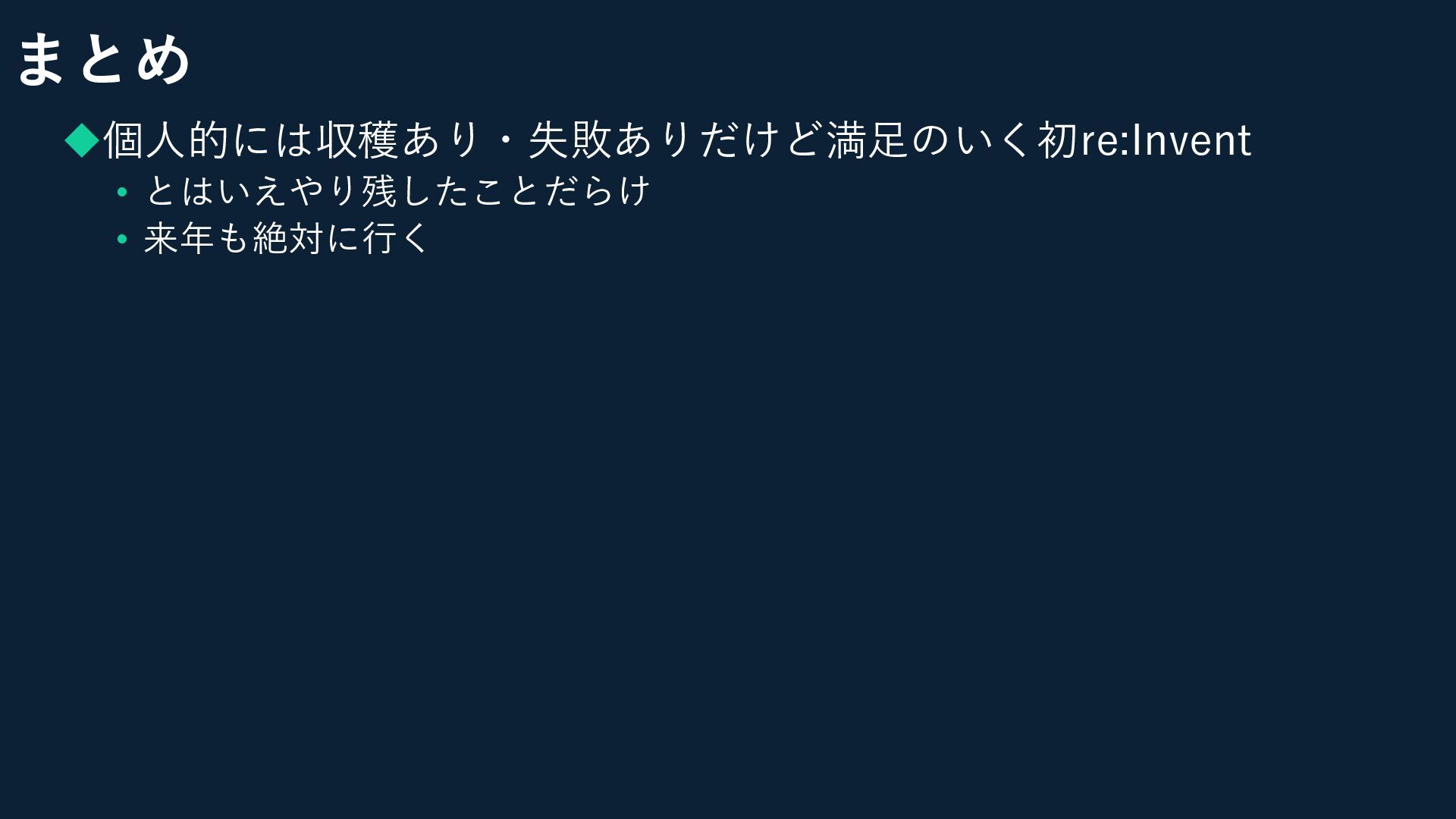 ◆個人的には収穫あり・失敗ありだけど満足のいく初re:Invent • とはいえやり残したことだらけ • 来年も絶対に行く まとめ