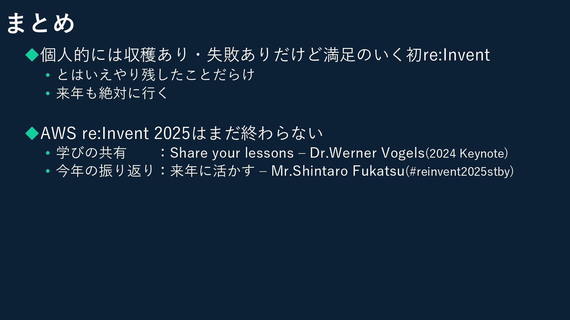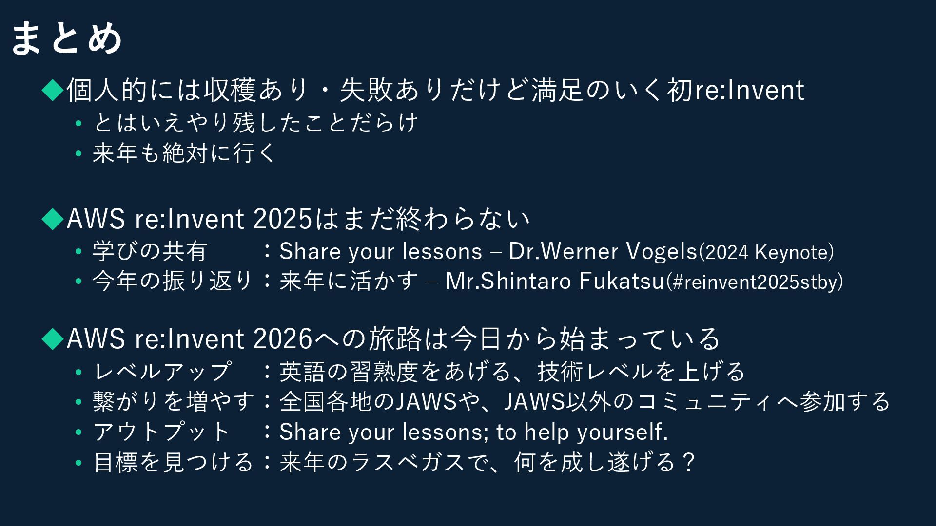 :Share your lessons – Dr.Werner Vogels(2024 Keynote) • 今年の振り返り:来年に活かす – Mr.Shintaro Fukatsu(#reinvent2025stby) ◆AWS re:Invent 2026への旅路は今日から始まっている • レベルアップ :英語の習熟度をあげる、技術レベルを上げる • 繋がりを増やす:全国各地のJAWSや、JAWS以外のコミュニティへ参加する • アウトプット :Share your lessons; to help yourself. • 目標を見つける:来年のラスベガスで、何を成し遂げる? まとめ