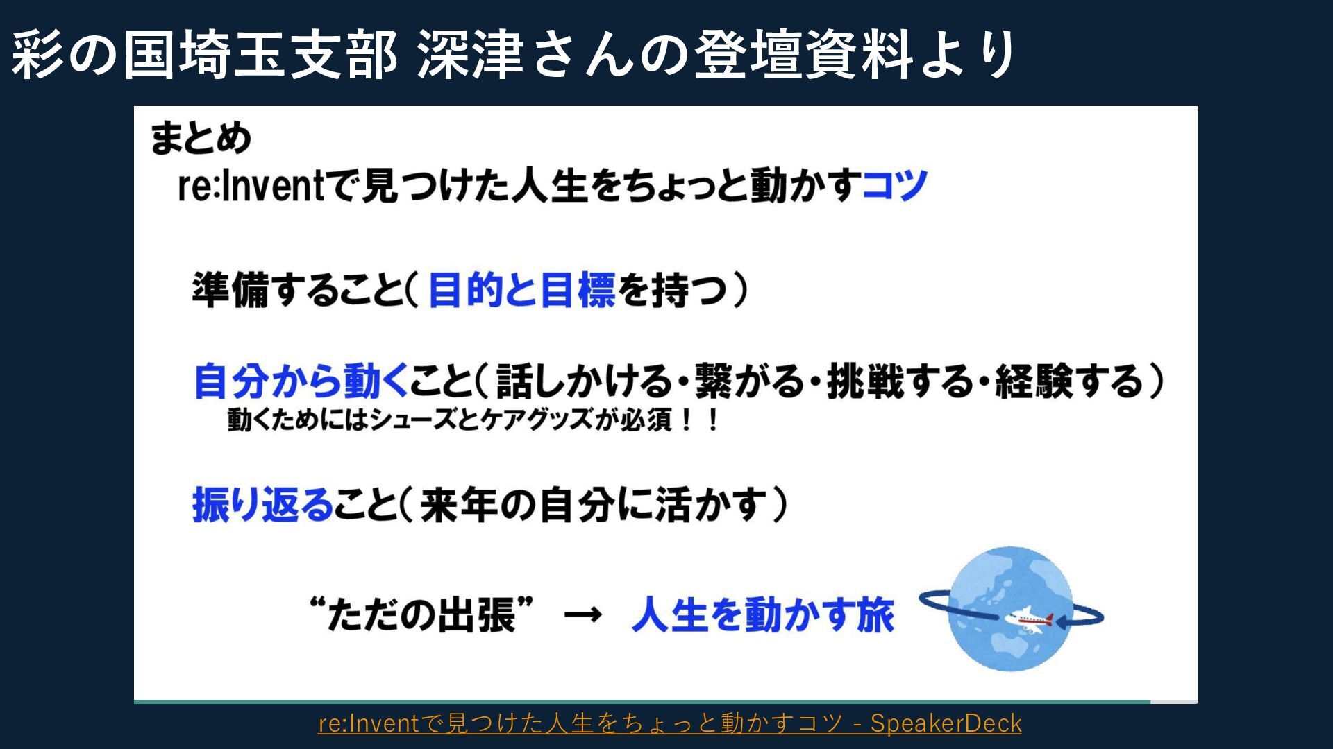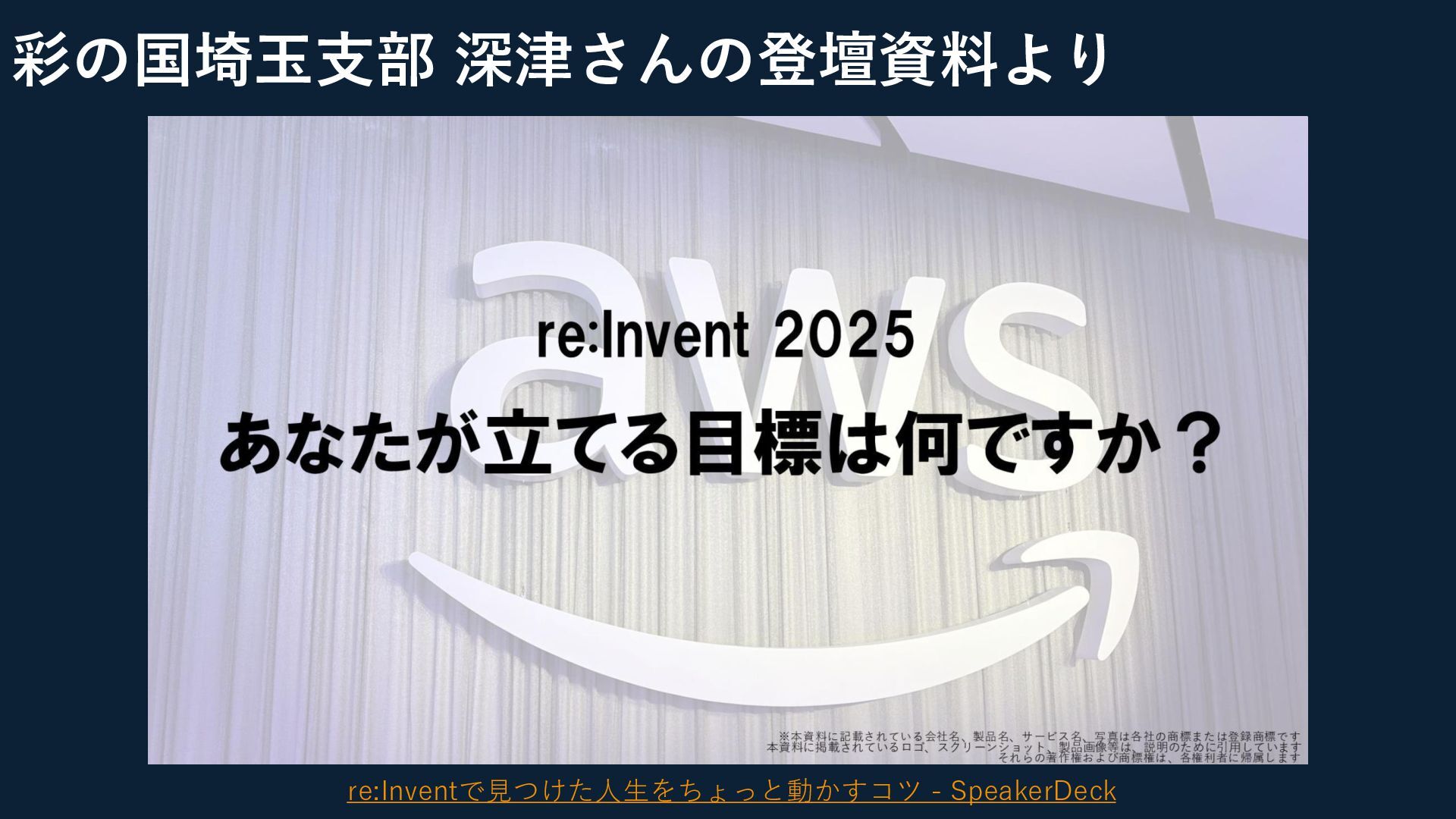 re:Invent 2025 事前勉強会にて 彩の国埼玉支部 深津さんの登壇資料より re:Inventで見つけた人生をちょっと動かすコツ - SpeakerDeck