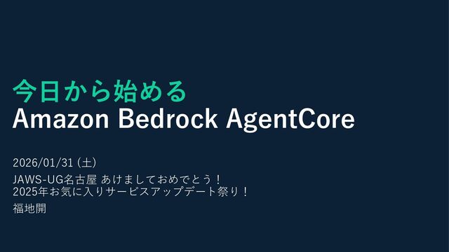 今日から始める Amazon Bedrock AgentCore 2026/01/31 (土) JAWS-UG名古屋 あけましておめでとう! 2025年お気に入りサービスアップデート祭り! 福地開