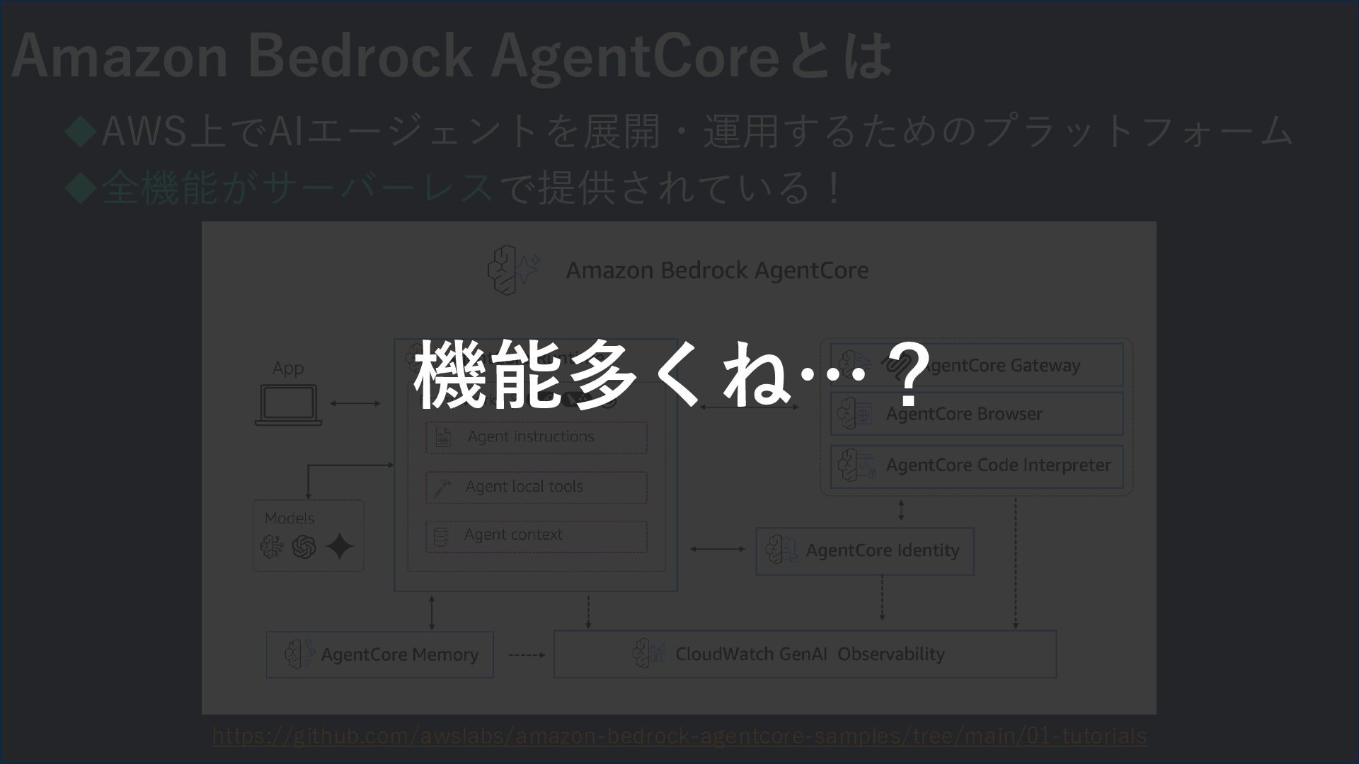Amazon Bedrock AgentCoreとは ◆AWS上でAIエージェントを展開・運用するためのプラットフォーム ◆全機能がサーバーレスで提供されている! https://github.com/awslabs/amazon-bedrock-agentcore-samples/tree/main/01-tutorials 機能多くね…?