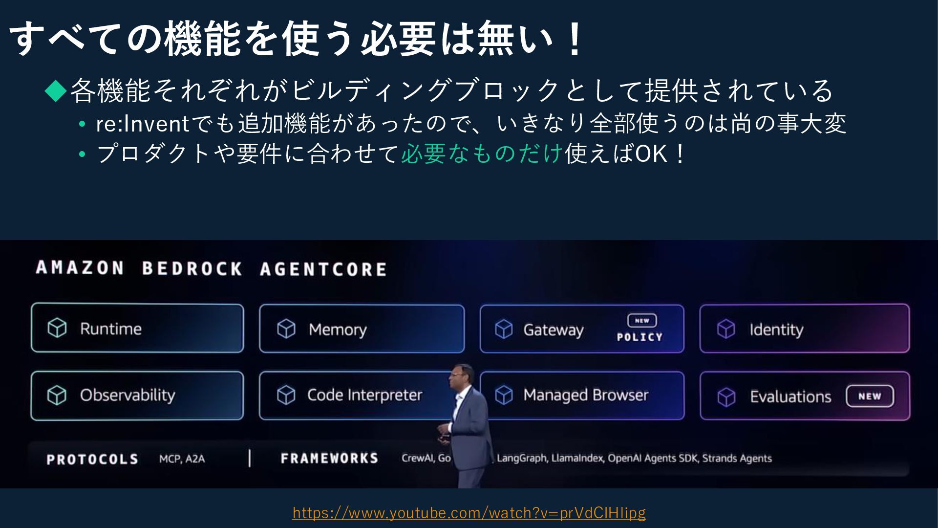 LLMの出力待機時間など、I/O 待ちの時間はCPUリソースに課金されない ◆好きなフレームワーク・好きなモデルを使うことができる • コードで書かれてさえいれば、どんなエージェントでも動かせる • エージェントだけでなく、ツールも一緒にデプロイ可能 • (フロントエンドは包含できないので別途必要) • ほぼLambdaと考えると、中で動くコードが必要 →フレームワーク使ってエージェントを定義する