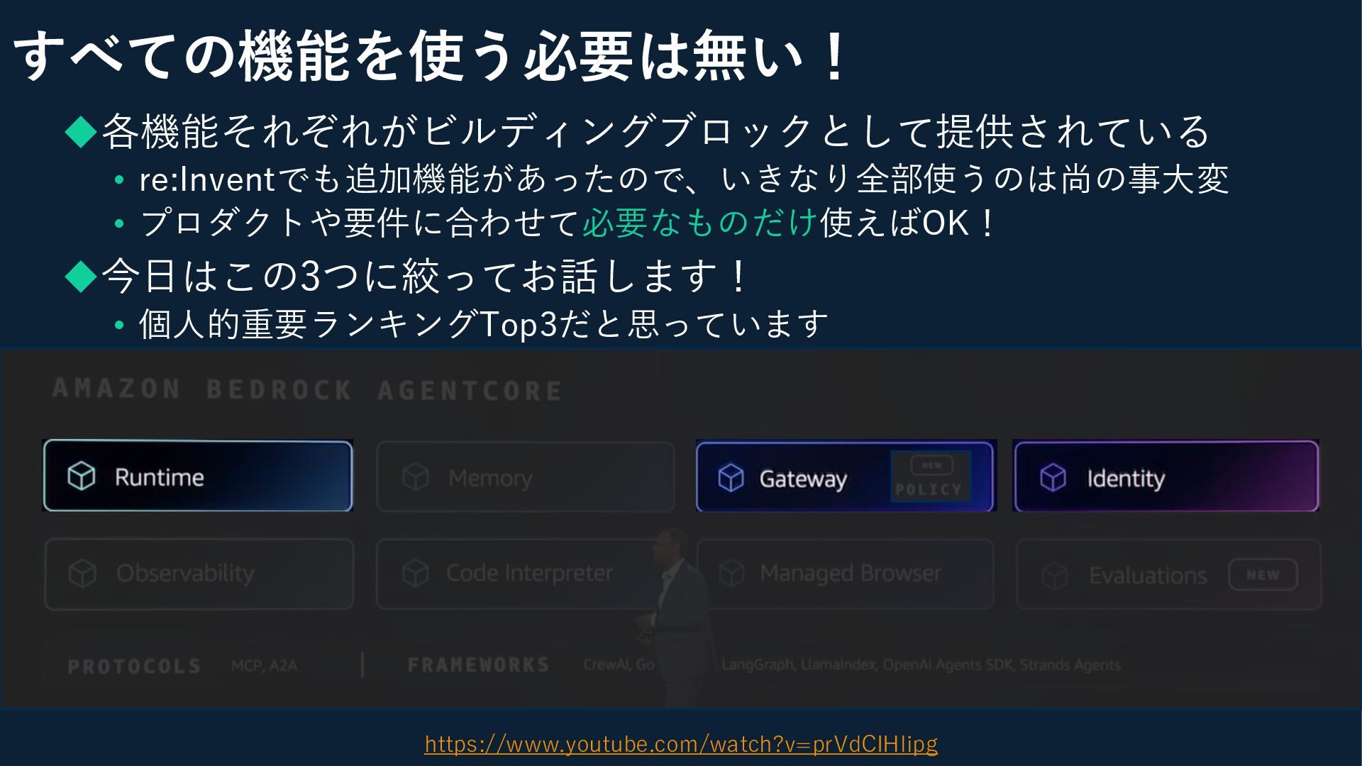 すべての機能を使う必要は無い! ◆各機能それぞれがビルディングブロックとして提供されている • re:Inventでも追加機能があったので、いきなり全部使うのは尚の事大変 • プロダクトや要件に合わせて必要なものだけ使えばOK! ◆今日はこの3つに絞ってお話します! • 個人的重要ランキングTop3だと思っています https://www.youtube.com/watch?v=prVdCIHlipg