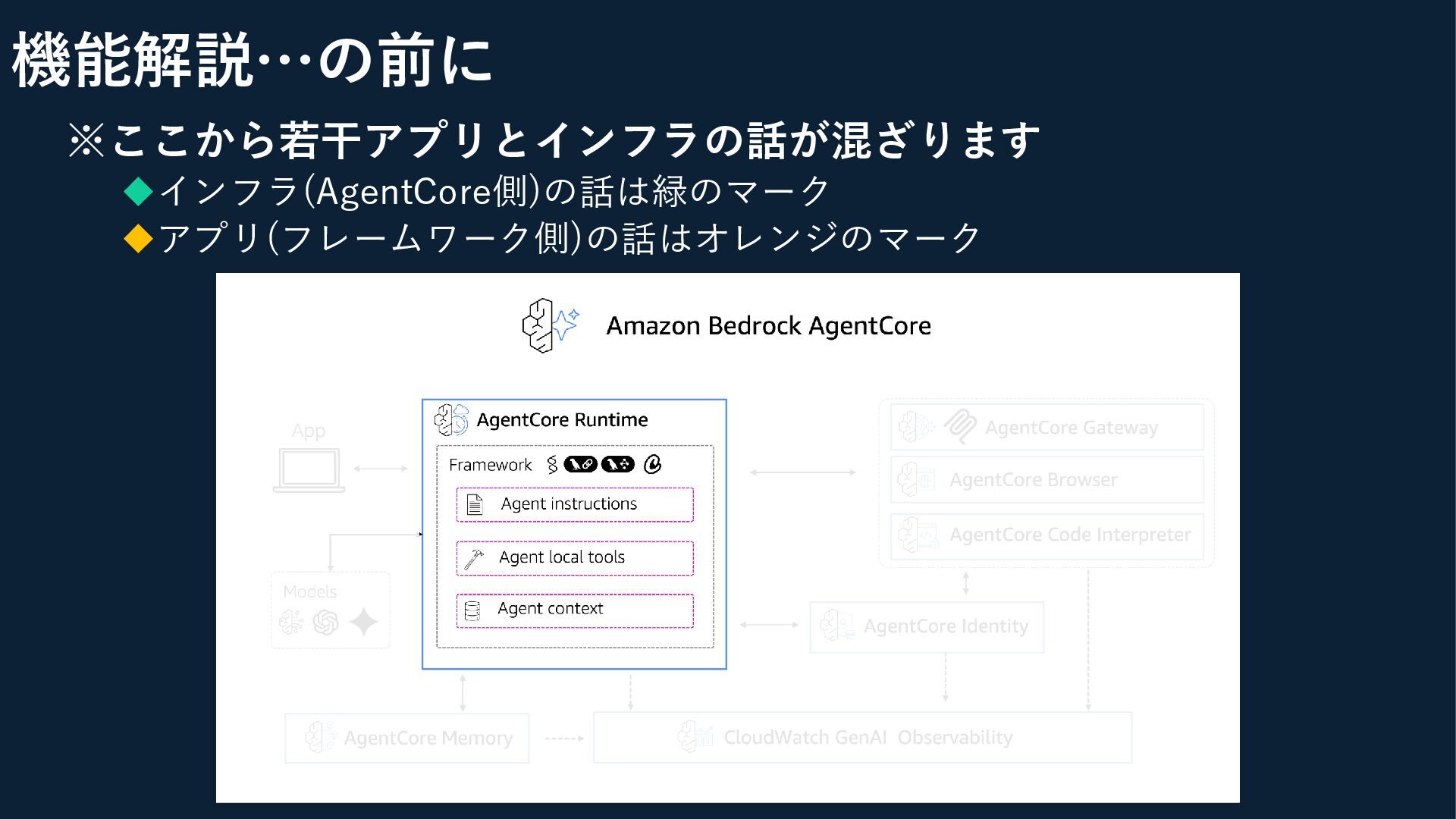 機能解説…の前に ※ここから若干アプリとインフラの話が混ざります ◆インフラ(AgentCore側)の話は緑のマーク ◆アプリ(フレームワーク側)の話はオレンジのマーク