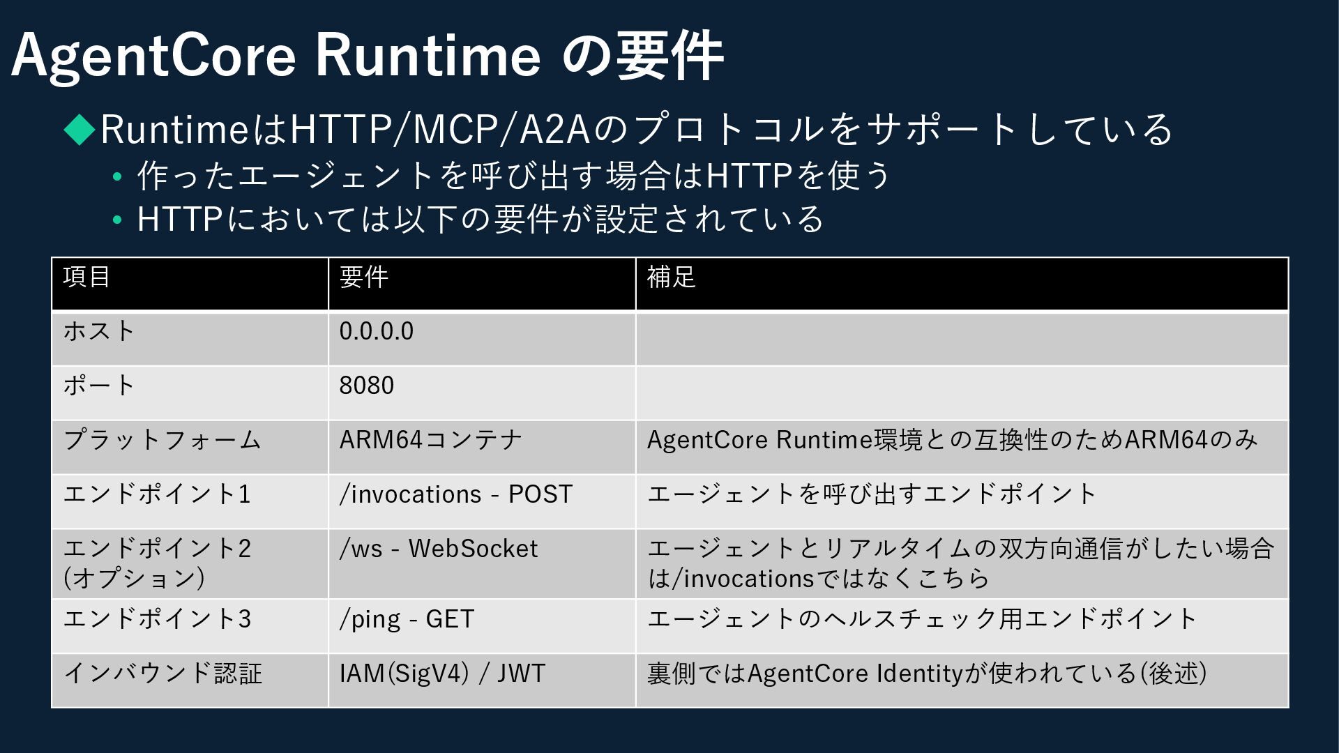 AgentCore Runtime の要件 ◆RuntimeはHTTP/MCP/A2Aのプロトコルをサポートしている • 作ったエージェントを呼び出す場合はHTTPを使う • HTTPにおいては以下の要件が設定されている 項目 要件