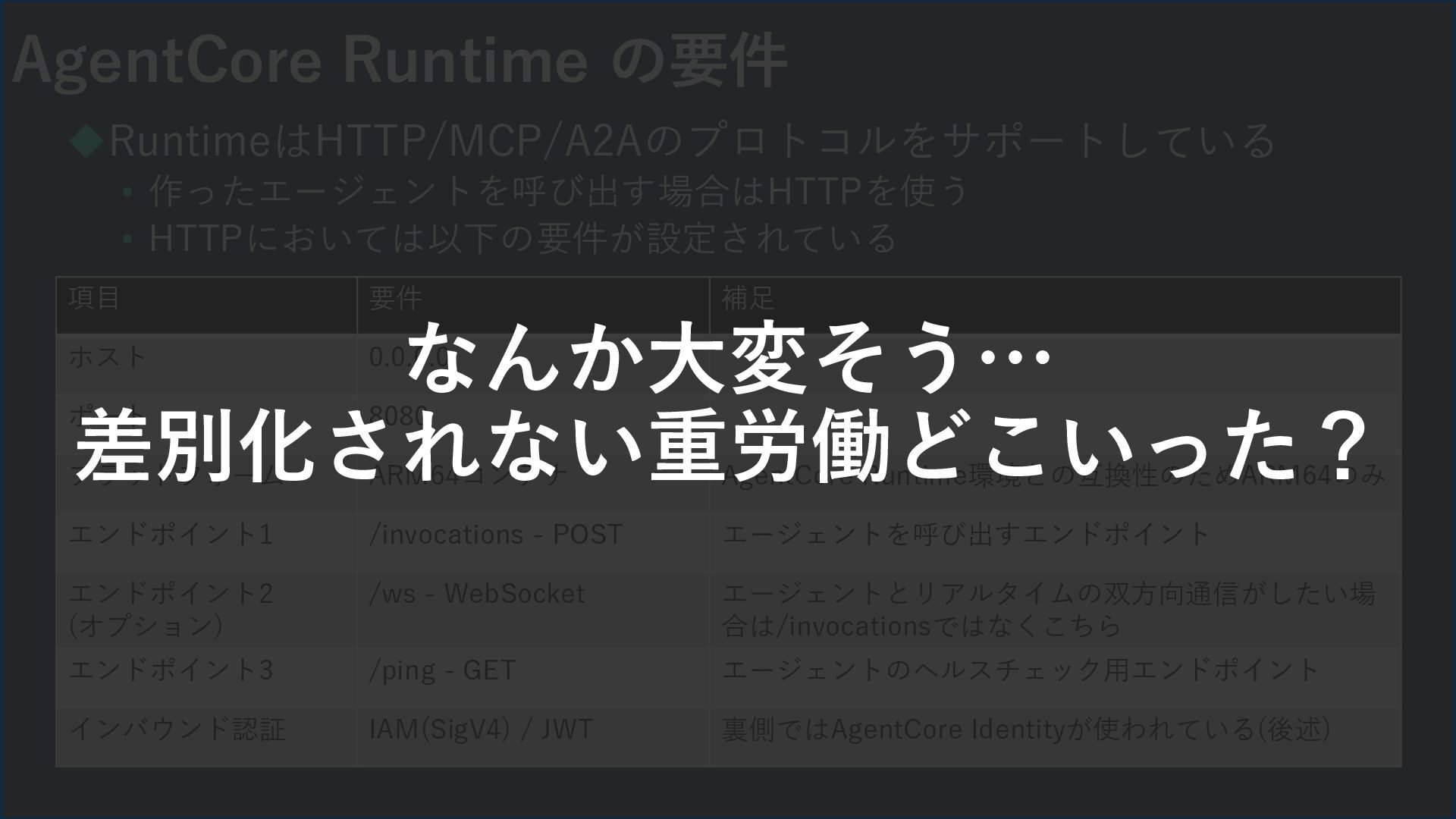 補足 ホスト 0.0.0.0 ポート 8080 プラットフォーム ARM64コンテナ AgentCore Runtime環境との互換性のためARM64のみ エンドポイント1 /invocations - POST エージェントを呼び出すエンドポイント エンドポイント2 (オプション) /ws - WebSocket エージェントとリアルタイムの双方向通信がしたい場 合は/invocationsではなくこちら エンドポイント3 /ping - GET エージェントのヘルスチェック用エンドポイント インバウンド認証 IAM(SigV4) / JWT 裏側ではAgentCore Identityが使われている(後述) なんか大変そう… 差別化されない重労働どこいった?