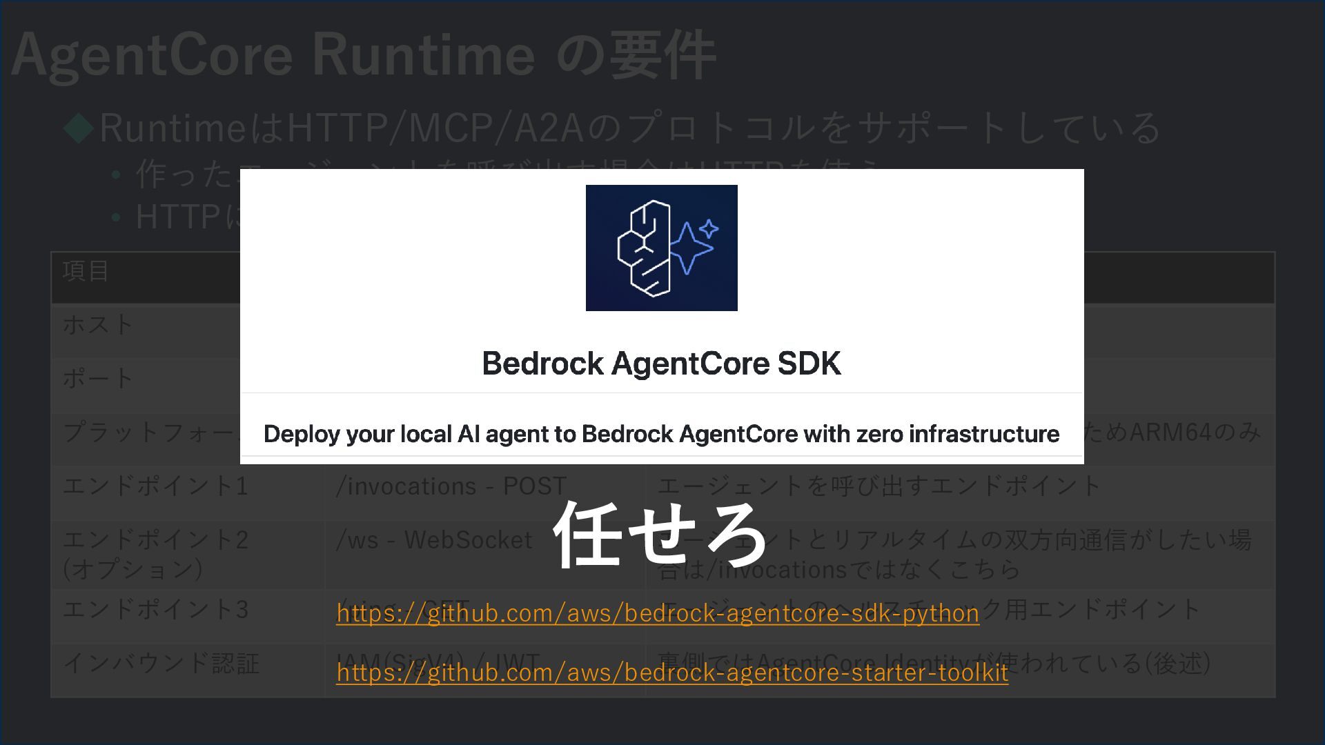 補足 ホスト 0.0.0.0 ポート 8080 プラットフォーム ARM64コンテナ AgentCore Runtime環境との互換性のためARM64のみ エンドポイント1 /invocations - POST エージェントを呼び出すエンドポイント エンドポイント2 (オプション) /ws - WebSocket エージェントとリアルタイムの双方向通信がしたい場 合は/invocationsではなくこちら エンドポイント3 /ping - GET エージェントのヘルスチェック用エンドポイント インバウンド認証 IAM(SigV4) / JWT 裏側ではAgentCore Identityが使われている(後述) 任せろ https://github.com/aws/bedrock-agentcore-sdk-python https://github.com/aws/bedrock-agentcore-starter-toolkit