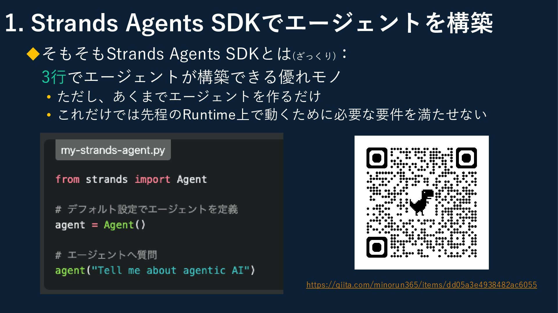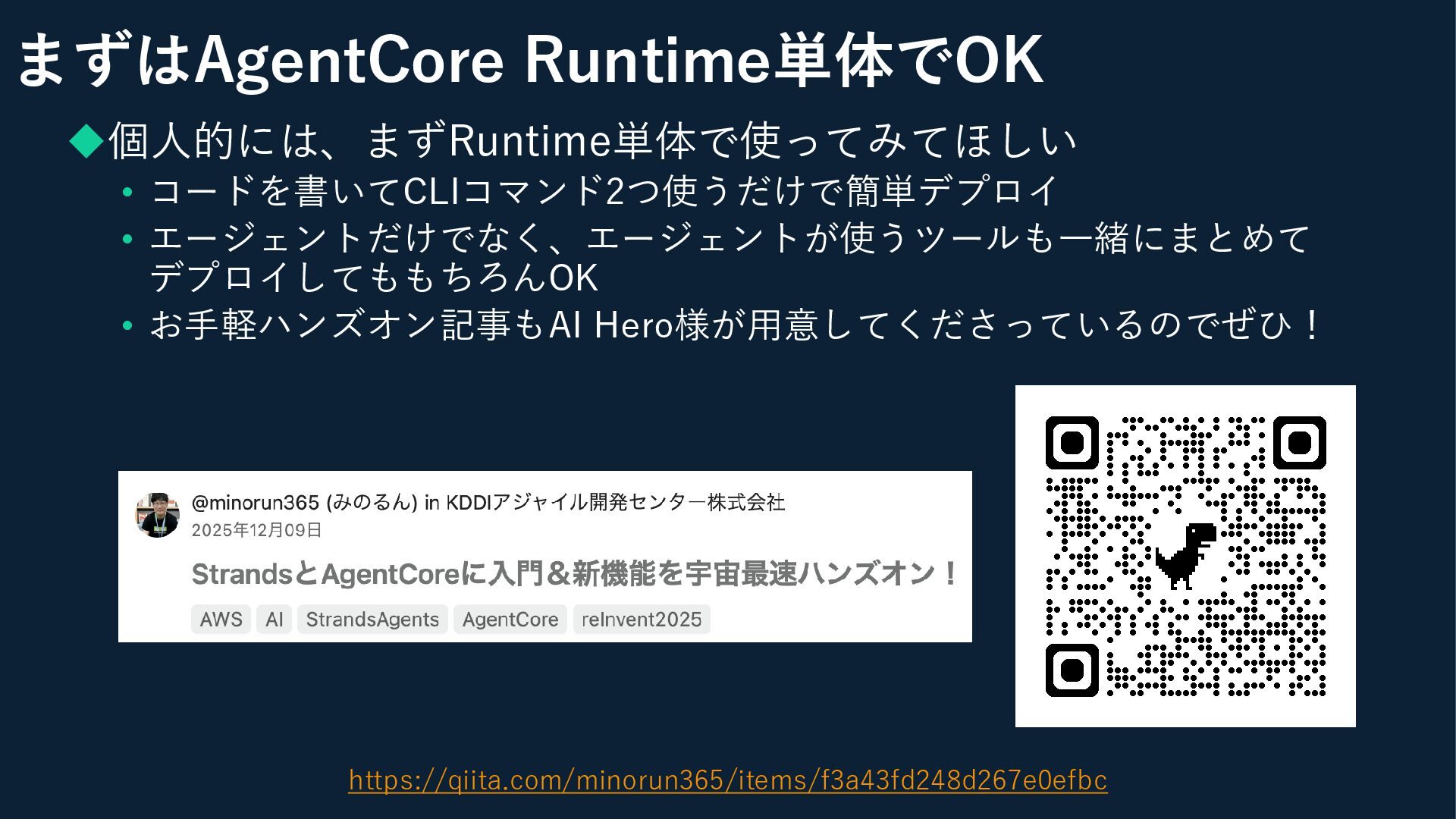ただし、あくまでエージェントを作るだけ • これだけでは先程のRuntime上で動くために必要な要件を満たせない https://qiita.com/minorun365/items/dd05a3e4938482ac6055