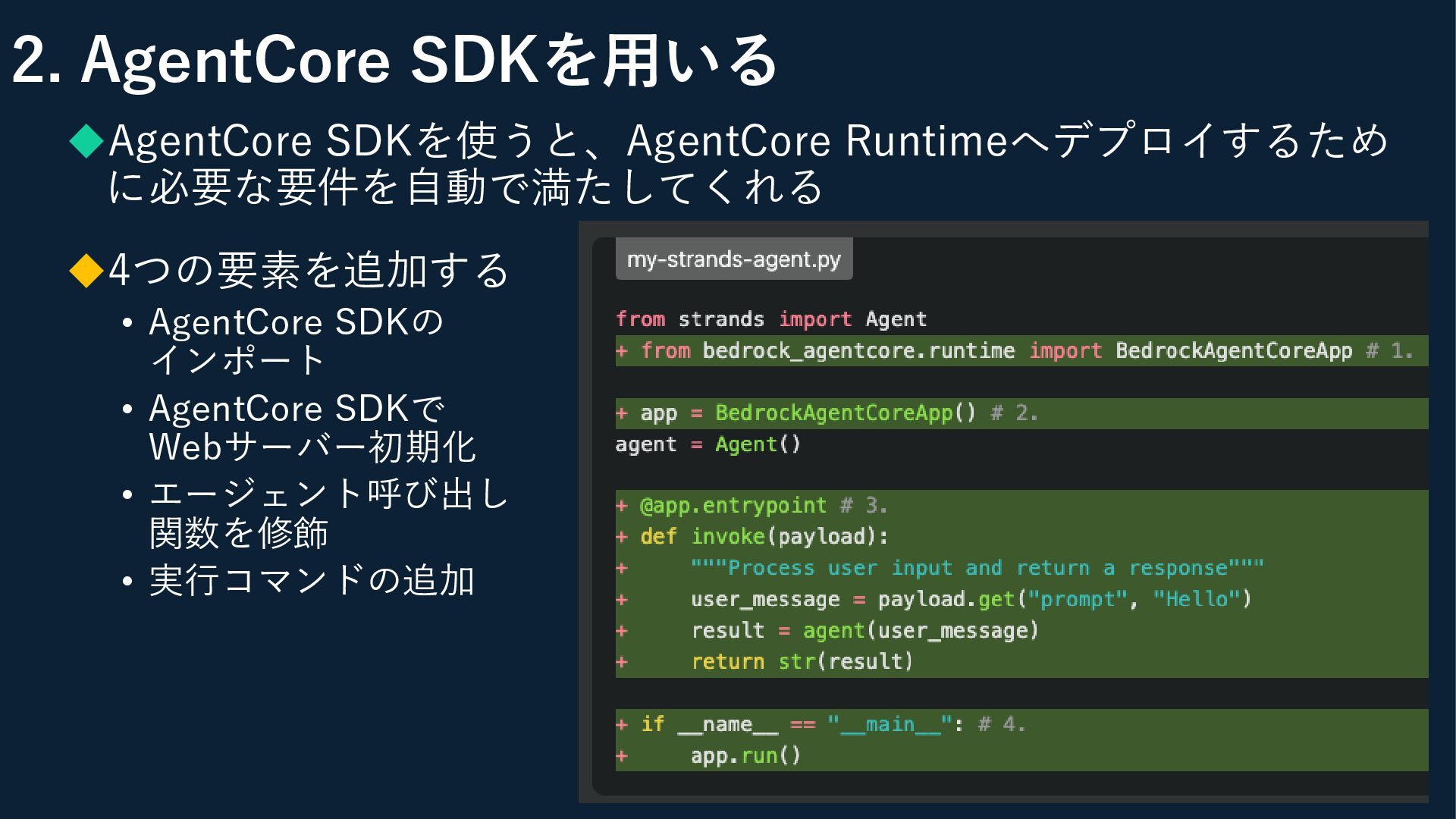 2. AgentCore SDKを用いる ◆AgentCore SDKを使うと、AgentCore Runtimeへデプロイするため に必要な要件を自動で満たしてくれる ◆4つの要素を追加する • AgentCore