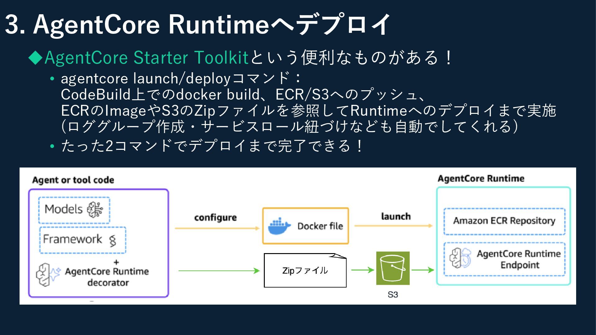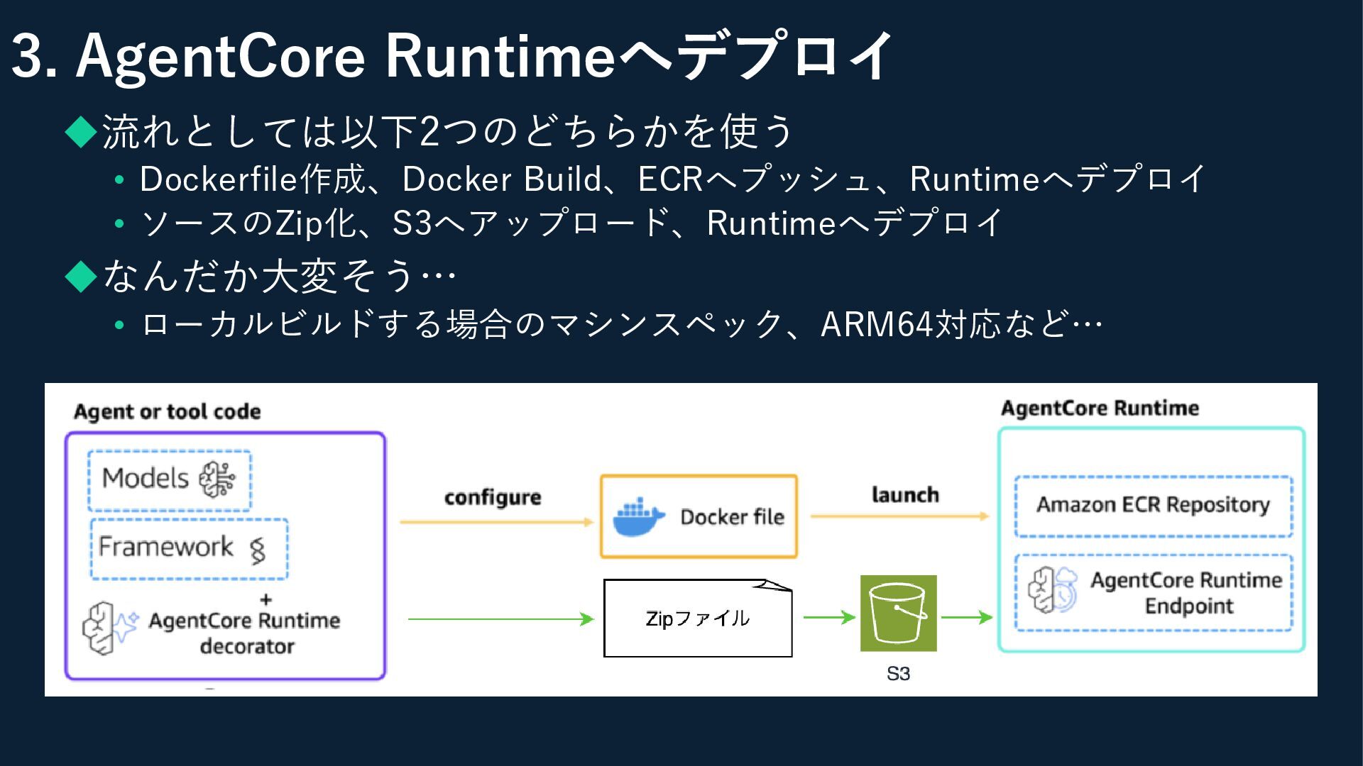 3. AgentCore Runtimeへデプロイ ◆流れとしては以下2つのどちらかを使う • Dockerfile作成、Docker Build、ECRへプッシュ、Runtimeへデプロイ… • ソースのZip化、S3へアップロード、Runtimeへデプロイ…
